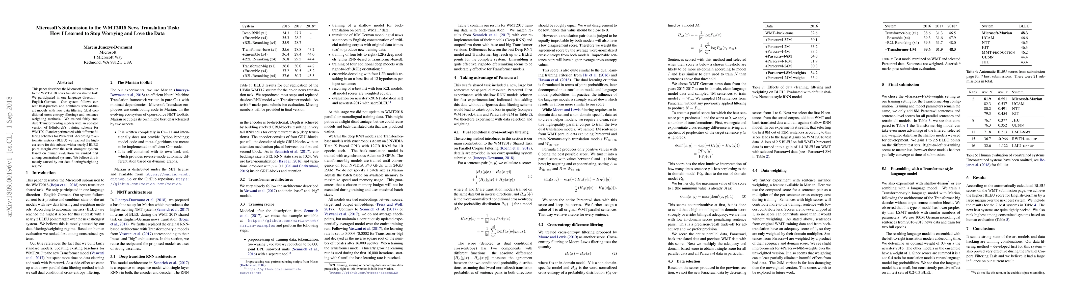 This paper describes the Microsoft submission to the WMT2018 news translation shared task. We participated in one language direction -- English-German. Our system follows current best-practice and combines state-of-the-art models with new data filtering (dual conditional cross-entropy filtering) and sentence weighting methods. We trained fairly standard Transformer-big models with an updated version of Edinburgh's training scheme for WMT2017 and experimented with different filtering schemes for Paracrawl. According to automatic metrics (BLEU) we reached the highest score for this subtask with a nearly 2 BLEU point margin over the next strongest system. Based on human evaluation we ranked first among constrained systems. We believe this is mostly caused by our data filtering/weighting regime.