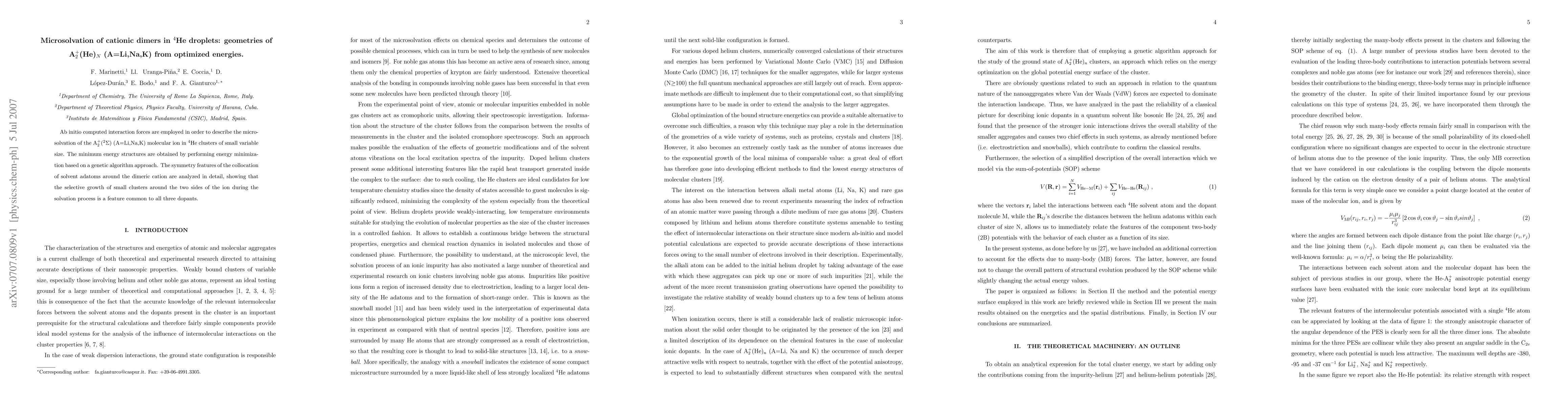 Researchers studied how $^4$He clusters interact with cationic dimers in this study, finding that small clusters form around the ion on both sides and using a genetic algorithm to determine the most stable configurations.