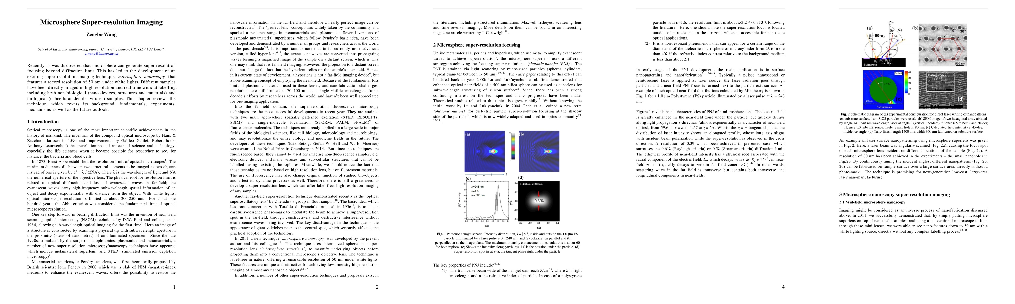 Microsphere nanoscopy, a novel super-resolution imaging technique, achieves record-breaking resolution of 50 nm under white light, enabling real-time imaging of both non-biological and biological samples without labeling. This chapter reviews the technique's background, mechanisms, and future potential.