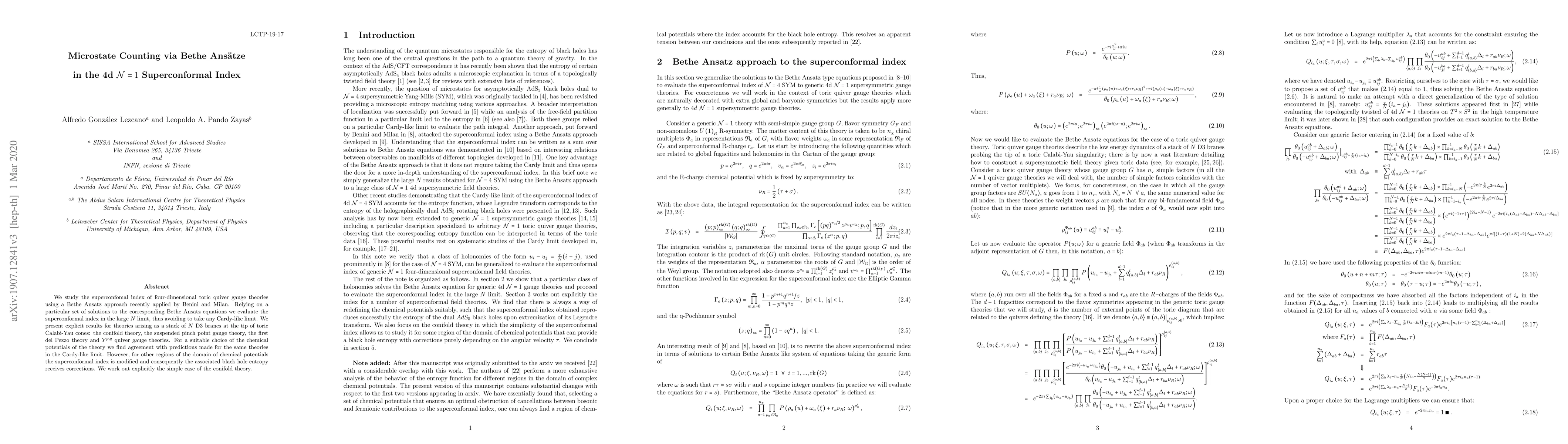 We study the superconfomal index of four-dimensional toric quiver gauge theories using a Bethe Ansatz approach recently applied by Benini and Milan. Relying on a particular set of solutions to the corresponding Bethe Ansatz equations we evaluate the superconformal index in the large $N$ limit, thus avoiding to take any Cardy-like limit. We present explicit results for theories arising as a stack of $N$ D3 branes at the tip of toric Calabi-Yau cones: the conifold theory, the suspended pinch point gauge theory, the first del Pezzo theory and $Y^{p,q}$ quiver gauge theories. For a suitable choice of the chemical potentials of the theory we find agreement with predictions made for the same theories in the Cardy-like limit. However, for other regions of the domain of chemical potentials the superconformal index is modified and consequently the associated black hole entropy receives corrections. We work out explicitly the simple case of the conifold theory.