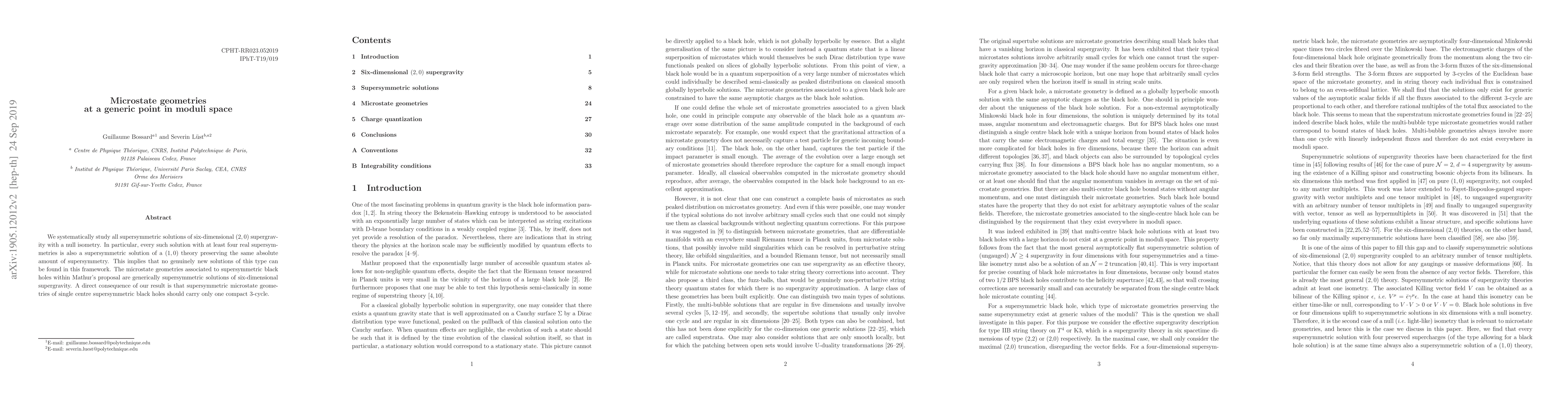 We systematically study all supersymmetric solutions of six-dimensional (2,0) supergravity with a null isometry. In particular, every such solution with at least four real supersymmetries is also a supersymmetric solution of a (1,0) theory preserving the same absolute amount of supersymmetry. This implies that no genuinely new solutions of this type can be found in this framework. The microstate geometries associated to supersymmetric black holes within Mathur's proposal are generically supersymmetric solutions of six-dimensional supergravity. A direct consequence of our result is that supersymmetric microstate geometries of single centre supersymmetric black holes should carry only one compact 3-cycle.
