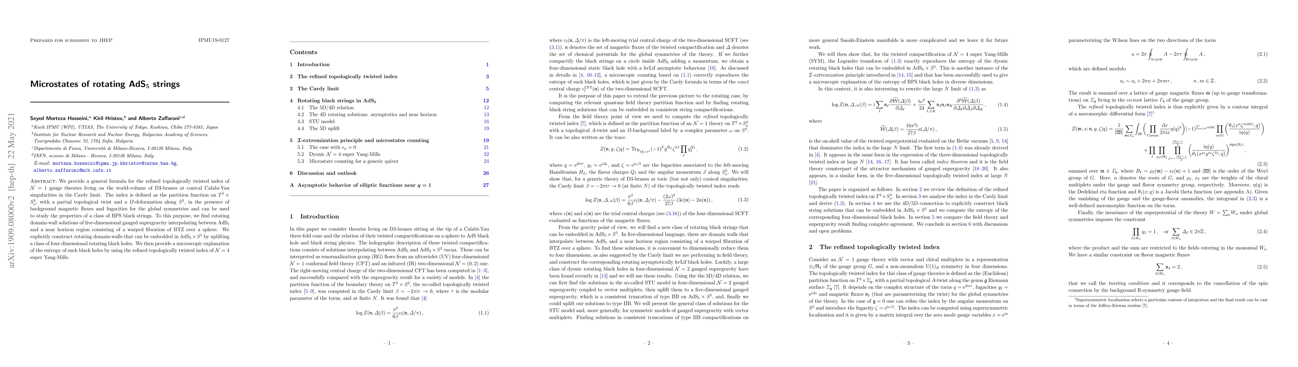 We provide a general formula for the refined topologically twisted index of $\mathcal{N}=1$ gauge theories living on the world-volume of D3-branes at conical Calabi-Yau singularities in the Cardy limit. The index is defined as the partition function on $T^2 \times S^2_\omega$, with a partial topological twist and a $\Omega$-deformation along $S^2$, in the presence of background magnetic fluxes and fugacities for the global symmetries and can be used to study the properties of a class of BPS black strings. To this purpose, we find rotating domain-wall solutions of five-dimensional gauged supergravity interpolating between AdS$_5$ and a near horizon region consisting of a warped fibration of BTZ over a sphere. We explicitly construct rotating domain-walls that can be embedded in AdS$_5 \times S^5$ by uplifting a class of four-dimensional rotating black holes. We then provide a microscopic explanation of the entropy of such black holes by using the refined topologically twisted index of $\mathcal{N}=4$ super Yang-Mills.