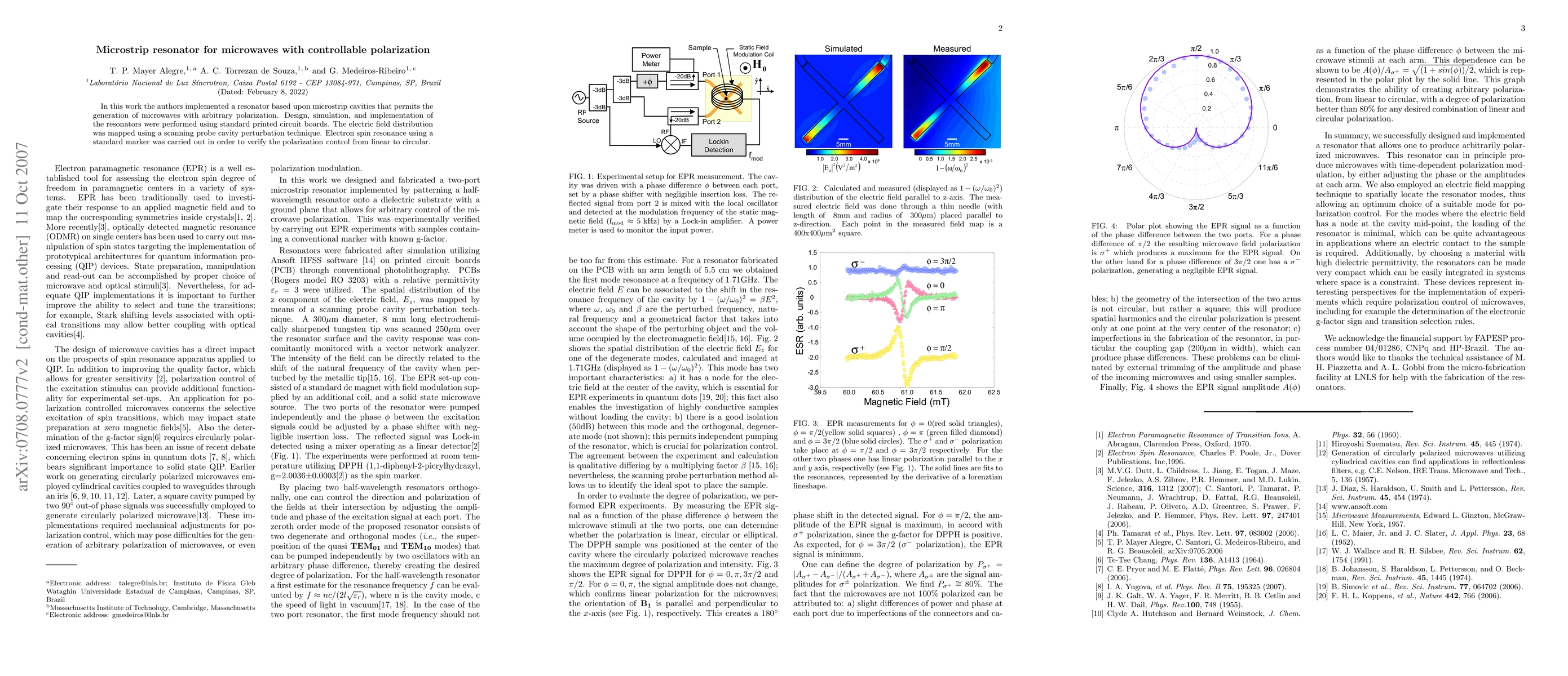 This research develops a microstrip resonator for microwaves that allows for the generation of microwaves with controllable polarization, verified through electric field mapping and electron spin resonance. The design and implementation utilize standard printed circuit boards.