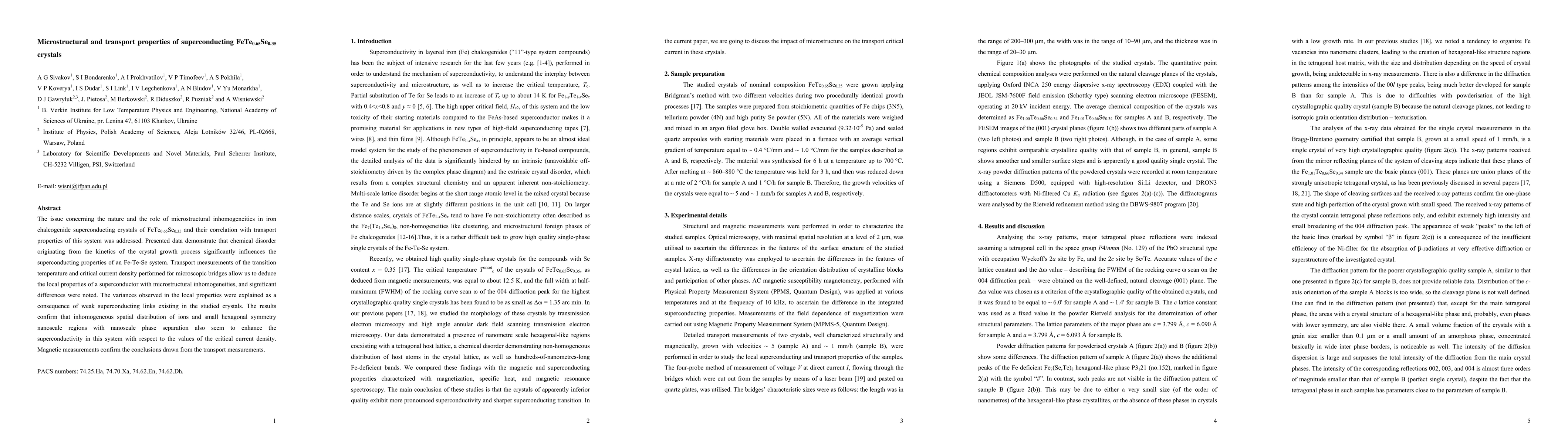 FeTe0.65Se0.35 crystals exhibit superconductivity influenced by microstructural inhomogeneities, which enhance critical current density; magnetic measurements confirm the findings.