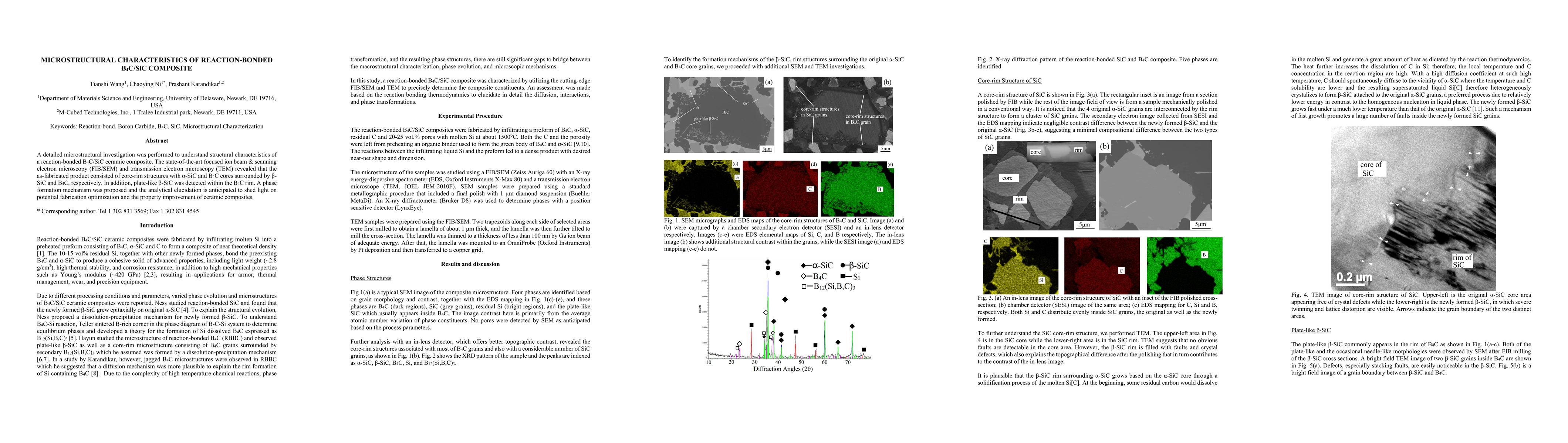 Researchers investigated a B4C/SiC ceramic composite using FIB/SEM and TEM, finding core-rim structures with different phases, including plate-like beta-SiC in the B4C rim. The study aims to optimize fabrication and improve properties of such composites.