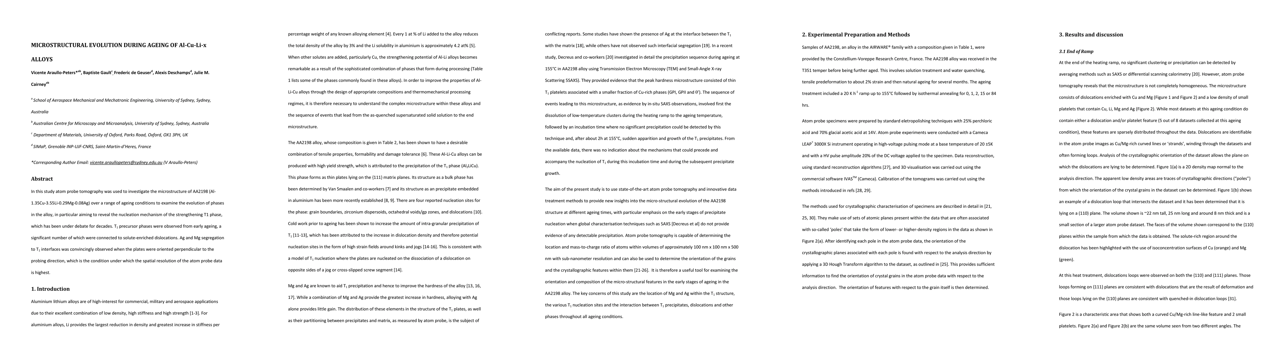 Researchers used atom probe tomography to study Al-Cu-Li alloys during ageing, revealing the formation of strengthening T1 phase through solute-enriched dislocations and Ag-Mg segregation at its interfaces.