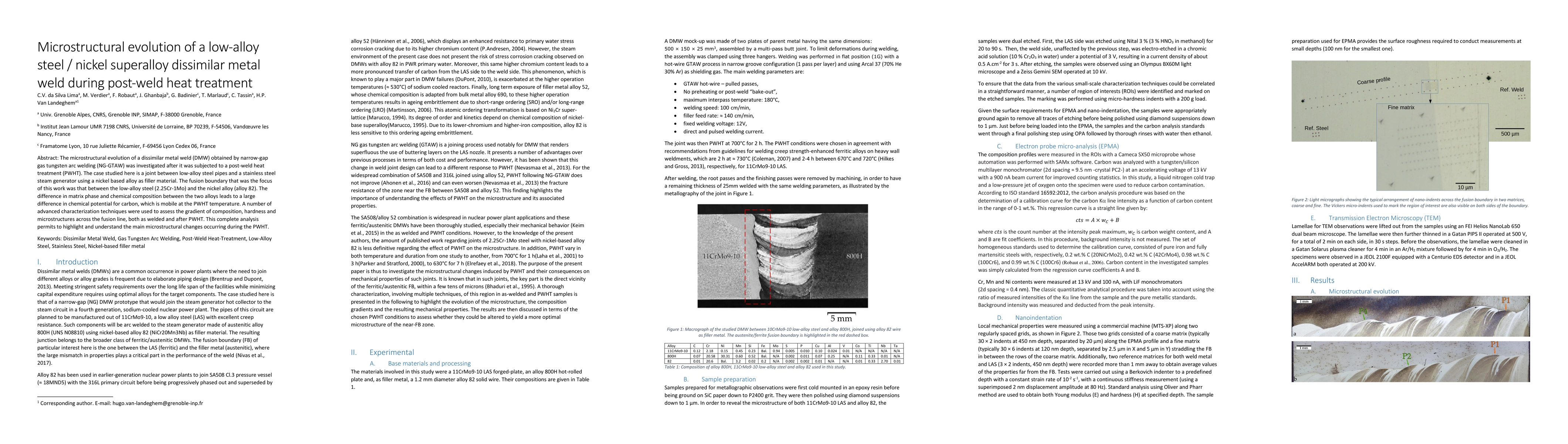 The microstructural evolution of a dissimilar metal weld (DMW) obtained by narrow-gap gas tungsten arc welding (NG-GTAW) was investigated after it was subjected to a post-weld heat treatment (PWHT). The case studied here is a joint between low-alloy steel pipes and a stainless steel steam generator using a nickel based alloy as filler material. The fusion boundary that was the focus of this work was that between the low-alloy steel (2.25Cr-1Mo) and the nickel alloy (alloy 82). The difference in matrix phase and chemical composition between the two alloys leads to a large difference in chemical potential for carbon, which is mobile at the PWHT temperature. A number of advanced characterization techniques were used to assess the gradient of composition, hardness and microstructures across the fusion line, both as welded and after PWHT. This complete analysis permits to highlight and understand the main microstructural changes occurring during the PWHT.