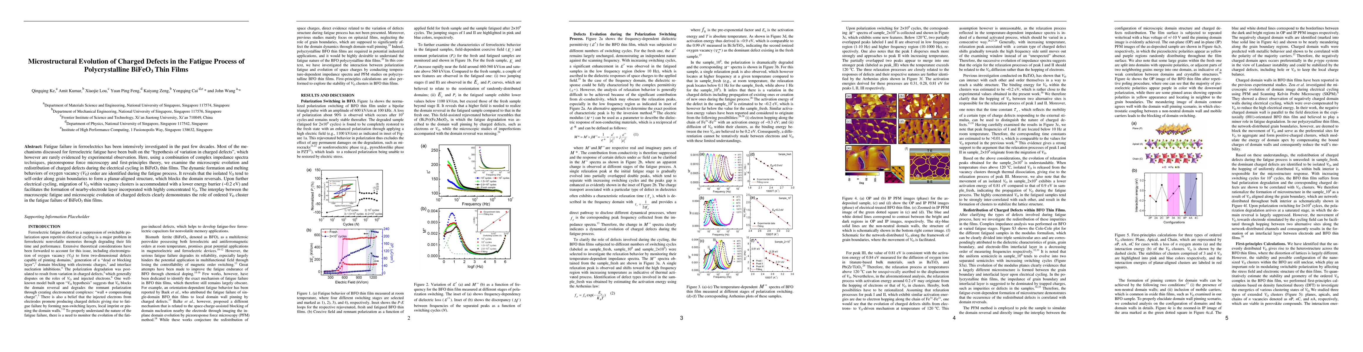 This study investigates the microstructural evolution of charged defects in BiFeO3 thin films during fatigue using advanced techniques. It reveals that oxygen vacancies self-order along grain boundaries, forming clusters that impede domain reversals and contribute to fatigue failure.