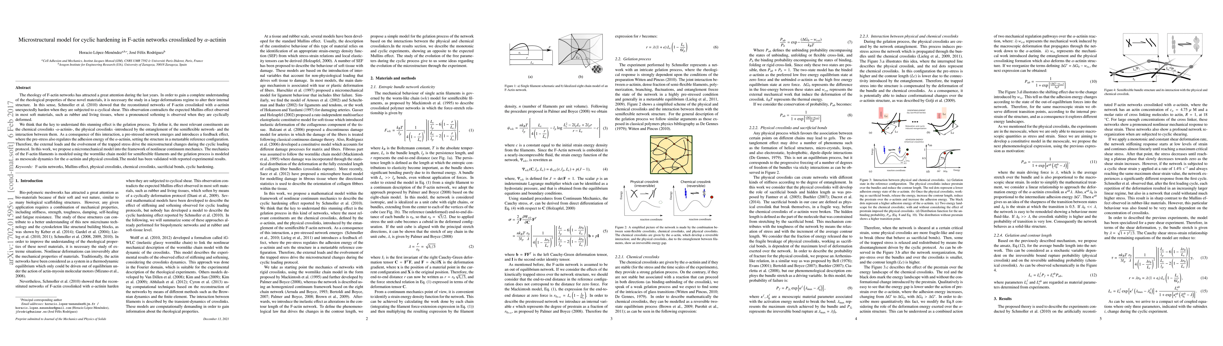 The rheology of F-actin networks has attracted a great attention during the last years. In order to gain a complete understanding of the rheological properties of these novel materials, it is necessary the study in a large deformations regime to alter their internal structure. In this sense, Schmoller et al. 2010 showed that the reconstituted networks of F-actin crosslinked with $\alpha$-actinin unexpectedly harden when they are subjected to a cyclical shear. This observation contradicts the expected Mullins effect observed in most soft materials, such as rubber and living tissues, where a pronounced softening is observed when they are cyclically deformed. We think that the key to understand this stunning effect is the gelation process. To define it, the most relevant constituents are the chemical crosslinks -$\alpha$-actinin-, the physical crosslinks -introduced by the entanglement of the semiflexible network- and the interaction between them. As a consequence of this interaction, a pre-stressed network emerges and introduces a feedback effect, where the pre-stress also regulates the adhesion energy of the $\alpha$-actinin, setting the structure in a metastable reference configuration. Therefore, the external loads and the evolvement of the trapped stress drive the microstructural changes during the cyclic loading protocol. In this work, we propose a micromechanical model into the framework of nonlinear continuum mechanics. The mechanics of the F-actin filaments is modeled using the wormlike chain model for semiflexible filaments and the gelation process is modeled as mesoscale dynamics for the $\alpha$-actinin and physical crosslink.The model has been validated with reported experimental results.