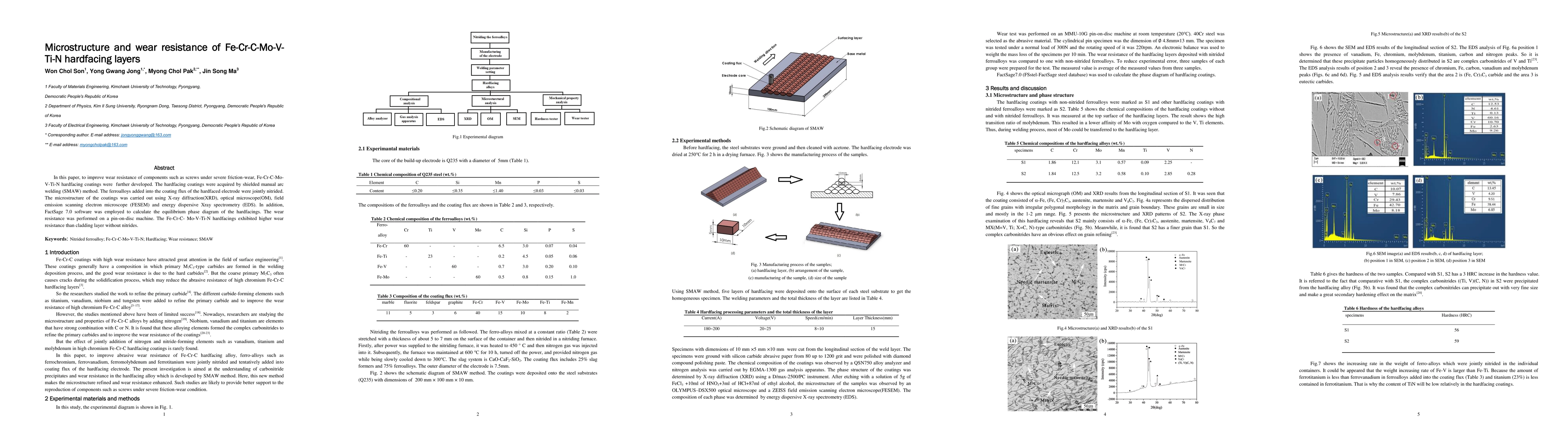 This paper develops Fe-Cr-C-Mo-V-Ti-N hardfacing coatings via shielded manual arc welding to enhance wear resistance for components like screws. The coatings show improved wear resistance compared to non-nitrided cladding layers, as confirmed by microstructure analysis and wear testing.