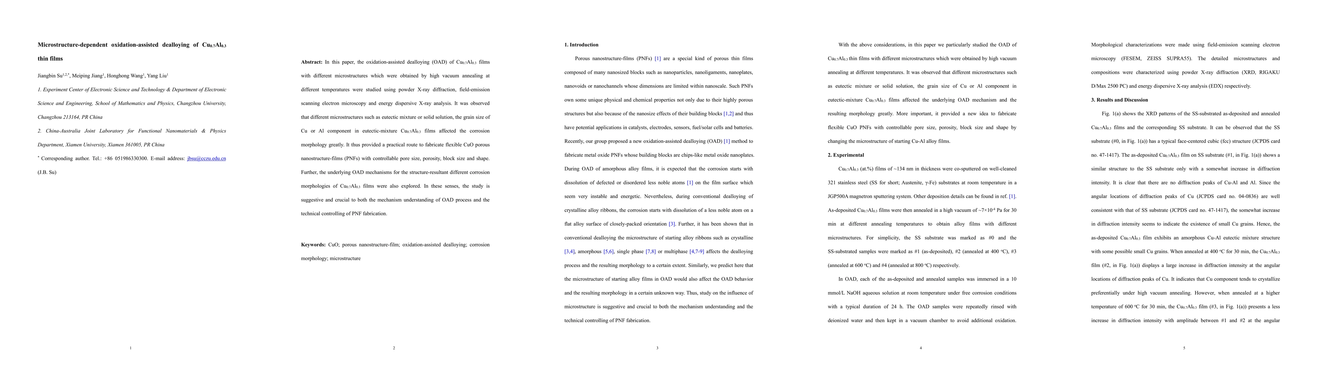In this paper, the oxidation-assisted dealloying (OAD) of Cu0.7Al0.3 films with different microstructures which were obtained by high vacuum annealing at different temperatures were studied using powder X-ray diffraction, field-emission scanning electron microscopy and energy dispersive X-ray analysis. It was observed that different microstructures such as eutectic mixture or solid solution, the grain size of Cu or Al component in eutectic-mixture Cu0.7Al0.3 films affected the corrosion morphology greatly. It thus provided a practical route to fabricate flexible CuO porous nanostructure-films (PNFs) with controllable pore size, porosity, block size and shape. Further, the underlying OAD mechanisms for the structure-resultant different corrosion morphologies of Cu0.7Al0.3 films were also explored. In these senses, the study is suggestive and crucial to both the mechanism understanding of OAD process and the technical controlling of PNF fabrication.