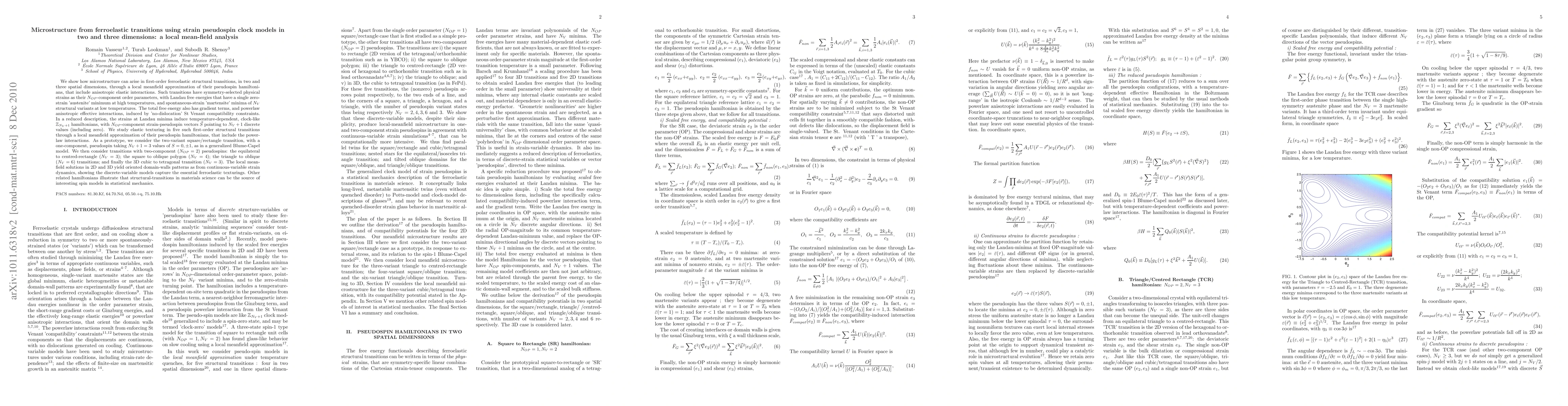 We show how microstructure can arise in first-order ferroelastic structural transitions, in two and three spatial dimensions, through a local meanfield approximation of their pseudospin hamiltonians, that include anisotropic elastic interactions. Such transitions have symmetry-selected physical strains as their $N_{OP}$-component order parameters, with Landau free energies that have a single zero-strain 'austenite' minimum at high temperatures, and spontaneous-strain 'martensite' minima of $N_V$ structural variants at low temperatures. In a reduced description, the strains at Landau minima induce temperature-dependent, clock-like $\mathbb{Z}_{N_V +1}$ hamiltonians, with $N_{OP}$-component strain-pseudospin vectors ${\vec S}$ pointing to $N_V + 1$ discrete values (including zero). We study elastic texturing in five such first-order structural transitions through a local meanfield approximation of their pseudospin hamiltonians, that include the powerlaw interactions. As a prototype, we consider the two-variant square/rectangle transition, with a one-component, pseudospin taking $N_V +1 =3$ values of $S= 0, \pm 1$, as in a generalized Blume-Capel model. We then consider transitions with two-component ($N_{OP} = 2$) pseudospins: the equilateral to centred-rectangle ($N_V =3$); the square to oblique polygon ($N_V =4$); the triangle to oblique ($N_V =6$) transitions; and finally the 3D cubic to tetragonal transition ($ N_V =3$). The local meanfield solutions in 2D and 3D yield oriented domain-walls patterns as from continuous-variable strain dynamics, showing the discrete-variable models capture the essential ferroelastic texturings. Other related hamiltonians illustrate that structural-transitions in materials science can be the source of interesting spin models in statistical mechanics.