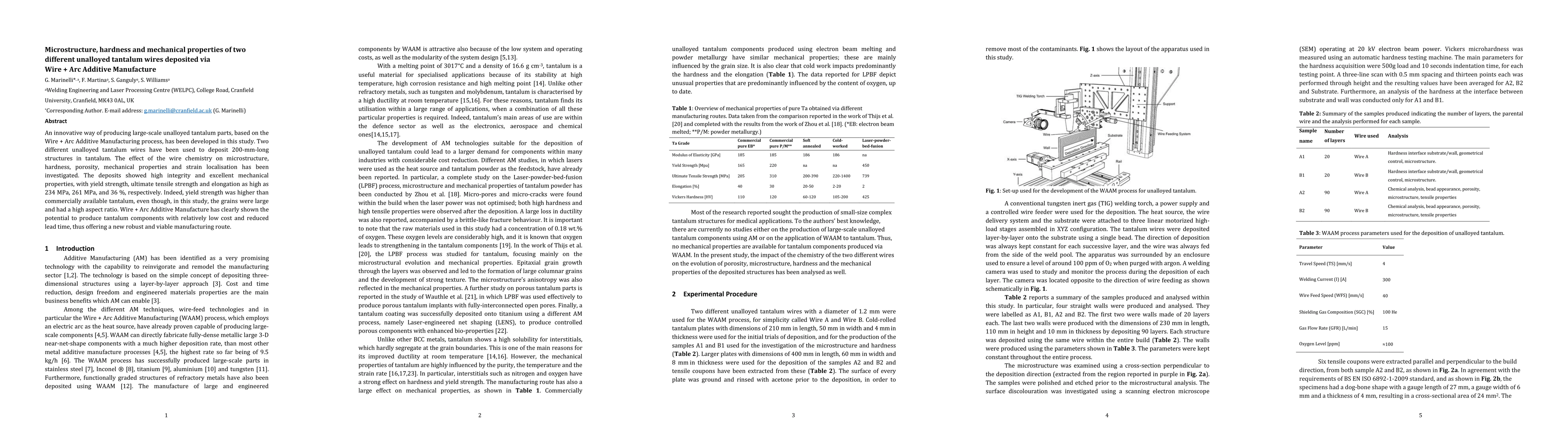 An innovative way of producing large-scale unalloyed tantalum parts, based on the Wire + Arc Additive Manufacturing process, has been developed in this study. Two different unalloyed tantalum wires have been used to deposit 200-mm-long structures in tantalum. The effect of the wire chemistry on microstructure, hardness, porosity, mechanical properties and strain localisation has been investigated. The deposits showed high integrity and excellent mechanical properties, with yield strength, ultimate tensile strength and elongation as high as 234 MPa, 261 MPa, and 36 %, respectively. Indeed, yield strength was higher than commercially available tantalum, even though, in this study, the grains were large and had a high aspect ratio. Wire + Arc Additive Manufacture has clearly shown the potential to produce tantalum components with relatively low cost and reduced lead time, thus offering a new robust and viable manufacturing route.