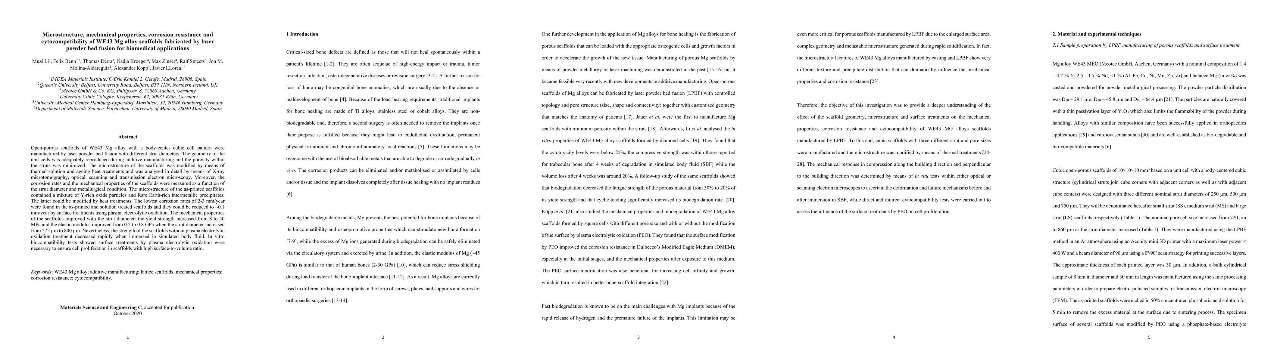 This study fabricates open-porous WE43 Mg alloy scaffolds via laser powder bed fusion, optimizing their microstructure, mechanical properties, and corrosion resistance through heat treatments and plasma electrolytic oxidation. The scaffolds demonstrated improved mechanical strength and reduced corrosion rates, with plasma electrolytic oxidation essential for cytocompatibility.