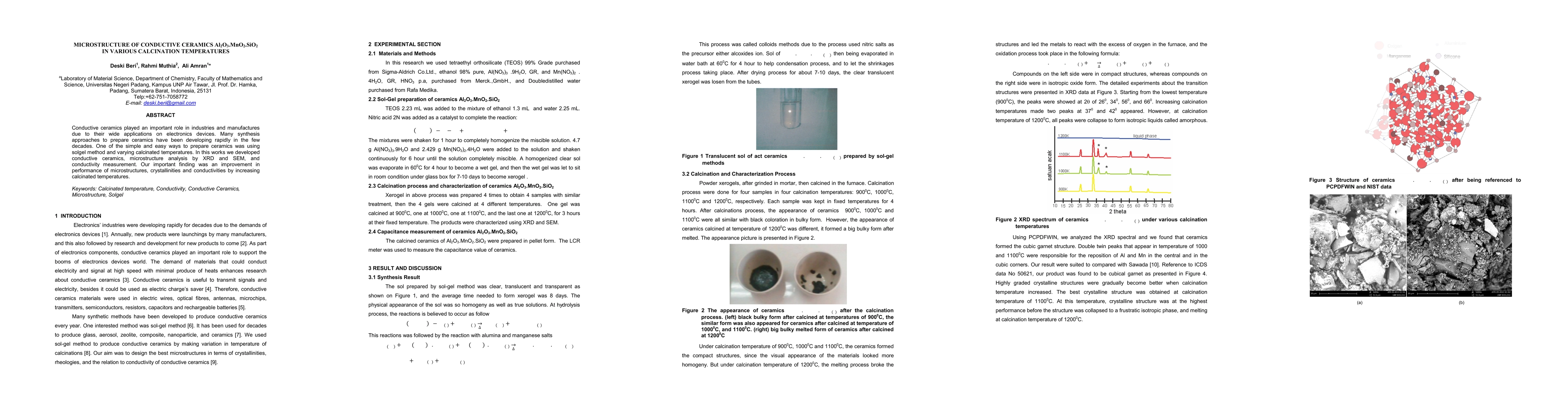 Summary: This study investigates the microstructure and conductivity of Al2O3.MnO2.SiO2 conductive ceramics prepared via sol-gel method, finding that higher calcination temperatures enhance microstructure, crystallinity, and electrical conductivity.