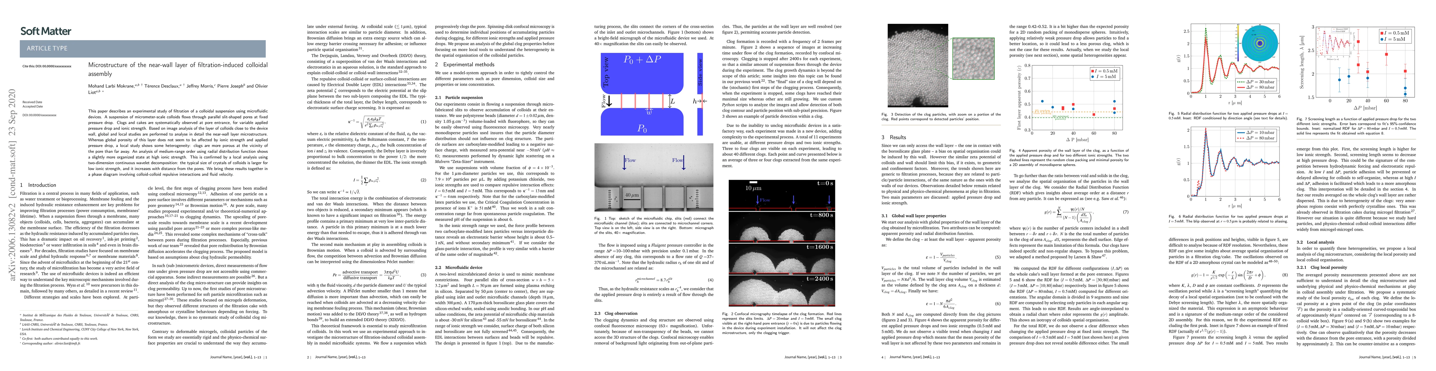 This paper describes an experimental study of filtration of a colloidal suspension using microfluidic devices. A suspension of micrometer-scale colloids flows through parallel slit-shaped pores at fixed pressure drop. Clogs and cakes are systematically observed at pore entrance, for variable applied pressure drop and ionic strength. Based on image analysis of the layer of colloids close to the device wall, global and local studies are performed to analyse in detail the near-wall layer microstructure. Whereas global porosity of this layer does not seem to be affected by ionic strength and applied pressure drop, a local study shows some heterogeneity: clogs are more porous at the vicinity of the pore than far away. An analysis of medium-range order using radial distribution function shows a slightly more organized state at high ionic strength. This is confirmed by a local analysis using two-dimension continuous wavelet decomposition: the typical size of crystals of colloids is larger for low ionic strength, and it increases with distance from the pores. We bring these results together in a phase diagram involving colloid-colloid repulsive interactions and fluid velocity.