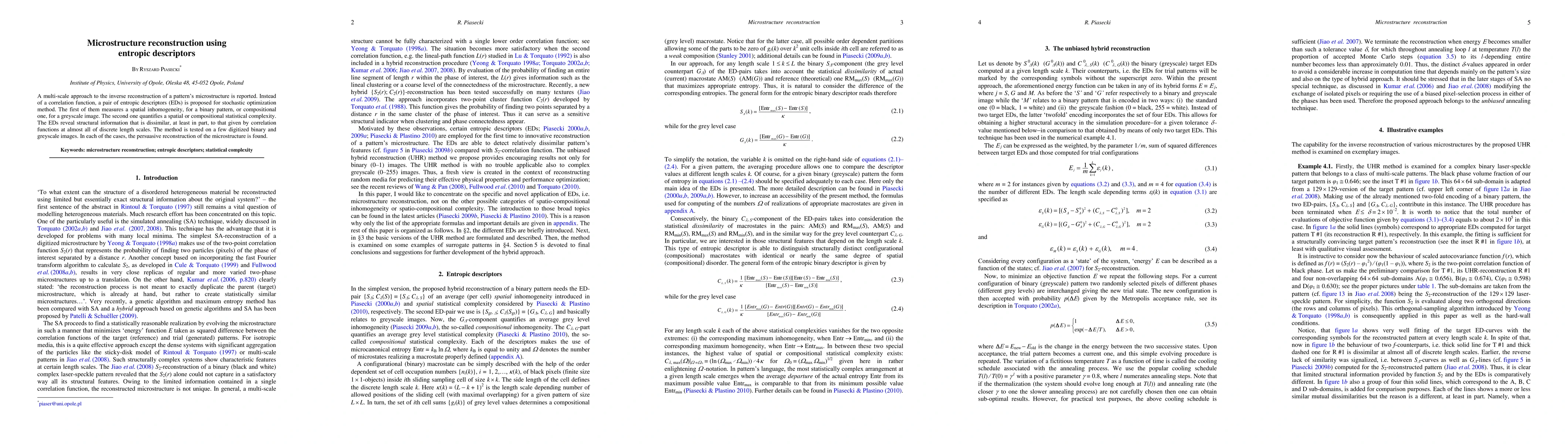 A multi-scale approach to the inverse reconstruction of a pattern's microstructure is reported. Instead of a correlation function, a pair of entropic descriptors (EDs) is proposed for stochastic optimization method. The first of them measures a spatial inhomogeneity, for a binary pattern, or compositional one, for a greyscale image. The second one quantifies a spatial or compositional statistical complexity. The EDs reveal structural information that is dissimilar, at least in part, to that given by correlation functions at almost all of discrete length scales. The method is tested on a few digitized binary and greyscale images. In each of the cases, the persuasive reconstruction of the microstructure is found.