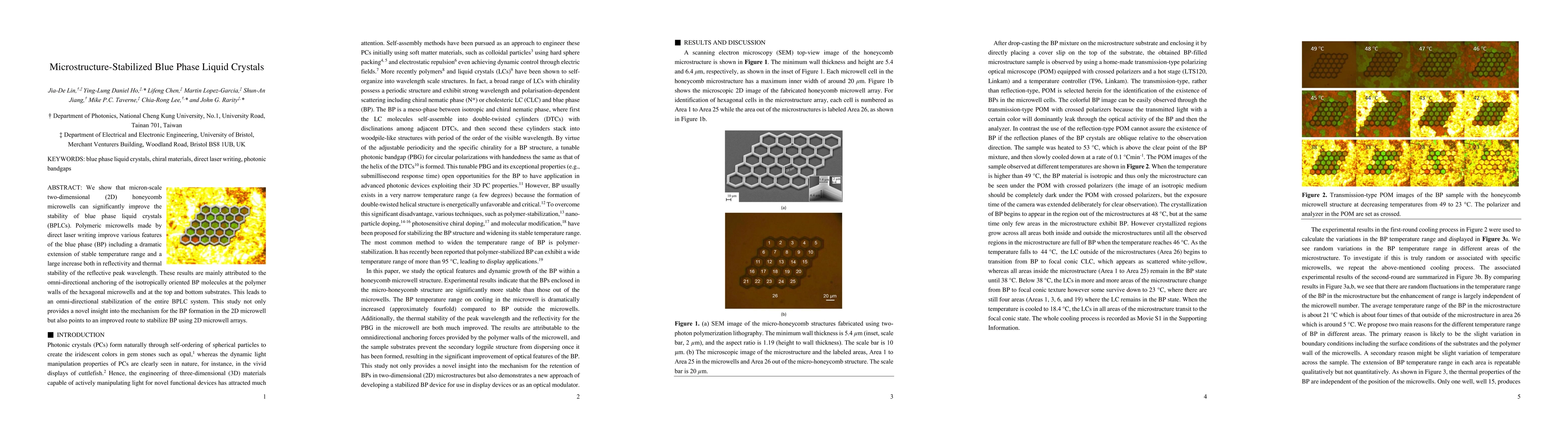 This study demonstrates that micron-scale 2D honeycomb microwells enhance the stability of blue phase liquid crystals by extending the temperature range and increasing reflectivity and thermal stability. The stabilization is due to omni-directional anchoring of BPLC molecules within the microwells.