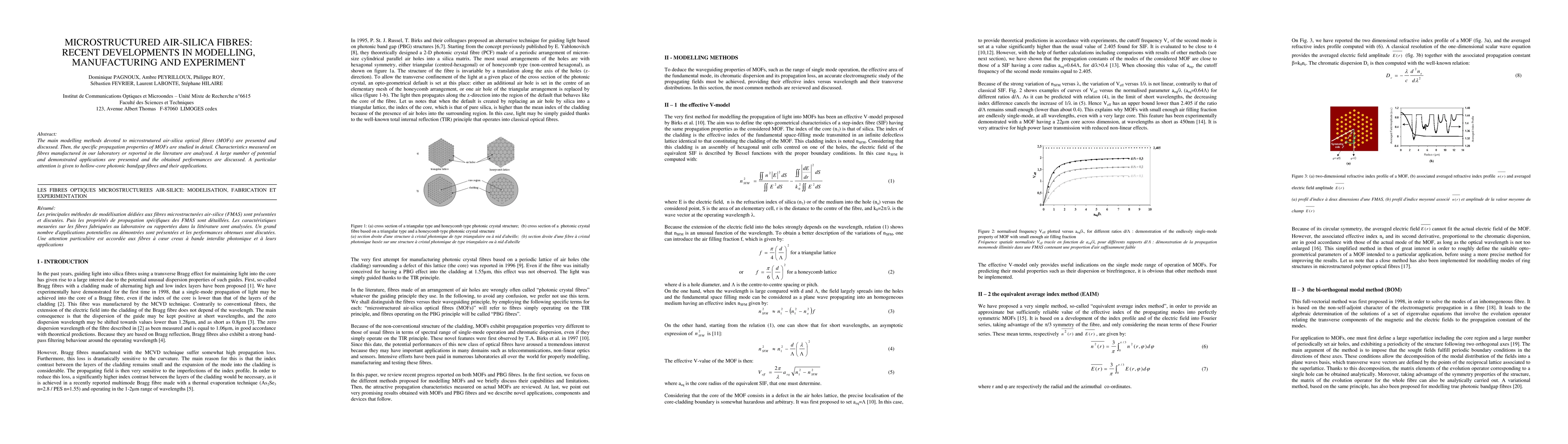 The main modelling methods devoted to microstrutured air-silica optical fibres (MOFs) are presented and discussed. Then, the specific propagation properties of MOFs are studied in detail. Characteristics measured on fibres manufactured in our laboratory or reported in the literature are analysed. A large number of potential and demonstrated applications are presented and the obtained performances are discussed. A particular attention is given to hollow- core photonic bandgap fibres and their applications.