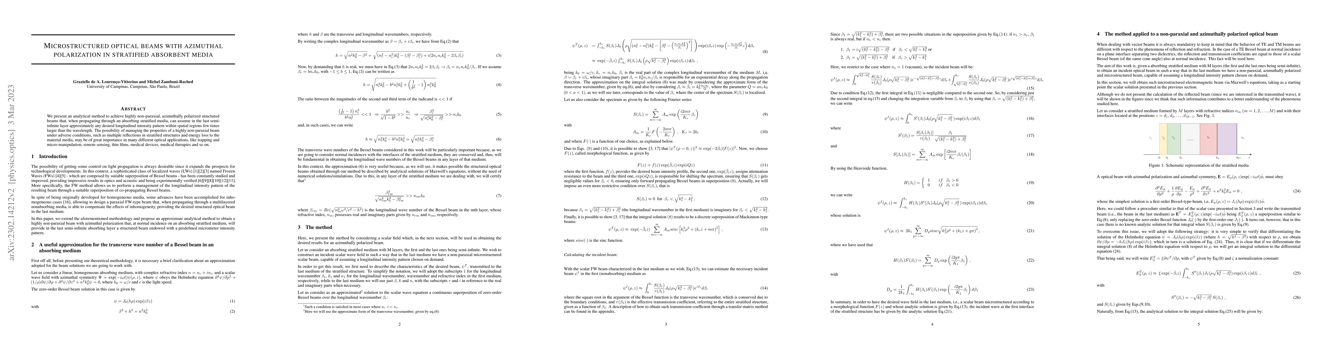 We present an analytical method to achieve highly non-paraxial, azimuthally polarized structured beams that, when propagating through an absorbing stratified media, can assume in the last semi-infinite layer approximately any desired longitudinal intensity pattern within spatial regions few times larger than the wavelength. The possibility of managing the properties of a highly non-paraxial beam under adverse conditions, such as multiple reflections in stratified structures and energy loss to the material media, may be of great importance in many different optical applications, like trapping and micro-manipulation, remote sensing, thin films, medical devices, medical therapies and so on.