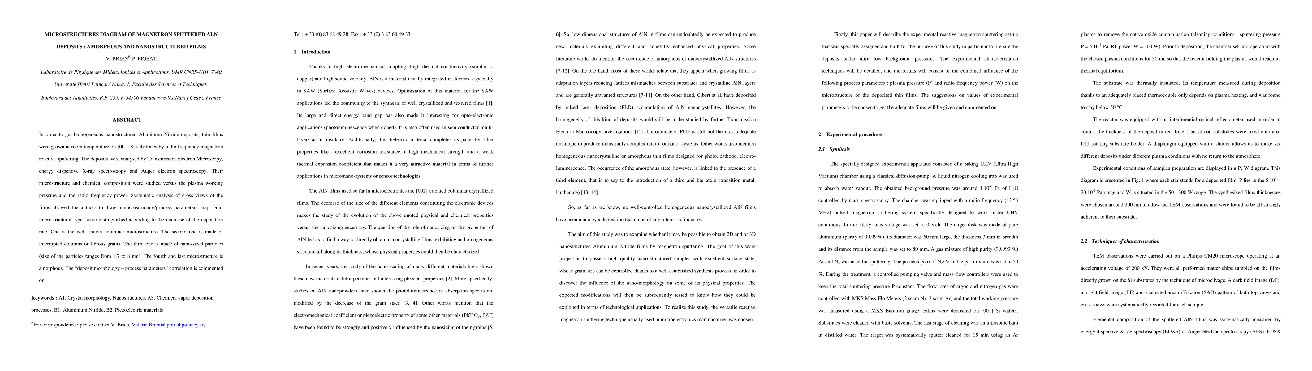 In order to get homogeneous nanostructured Aluminum Nitride deposits, thin films were grown at room temperature on [001] Si substrates by radio frequency magnetron reactive sputtering. The deposits were analysed by Transmission Electron Microscopy, energy dispersive X-ray spectroscopy and Auger electron spectroscopy. Their microstructure and chemical composition were studied versus the plasma working pressure and the radio frequency power. Systematic analysis of cross views of the films allowed the authors to draw a microstructure/process parameters map. Four microstructural types were distinguished according to the decrease of the deposition rate. One is the well-known columnar microstructure. The second one is made of interrupted columns or fibrous grains. The third one is made of nano-sized particles (size of the particles ranges from 1.7 to 8 nm). The fourth and last microstructure is amorphous. The "deposit morphology-process parameters" correlation is commented on.