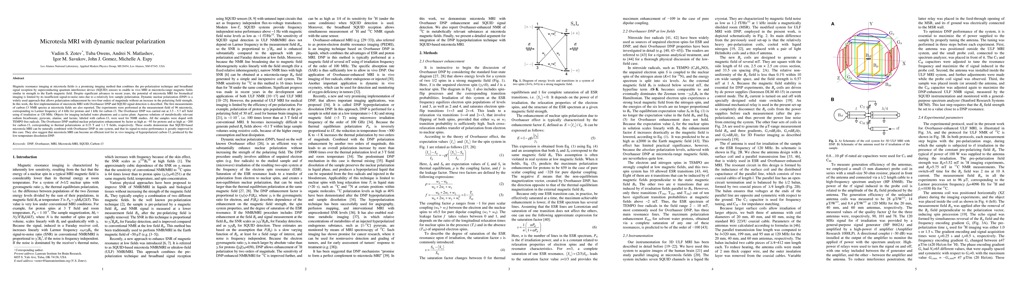 This paper presents the first implementation of microtesla MRI using Overhauser dynamic nuclear polarization (DNP) and SQUID sensors, achieving significant nuclear polarization enhancement for both protons and carbon-13. The results demonstrate improved signal-to-noise performance and suggest microtesla MRI's potential for efficient in vivo imaging of hyperpolarized carbon-13.