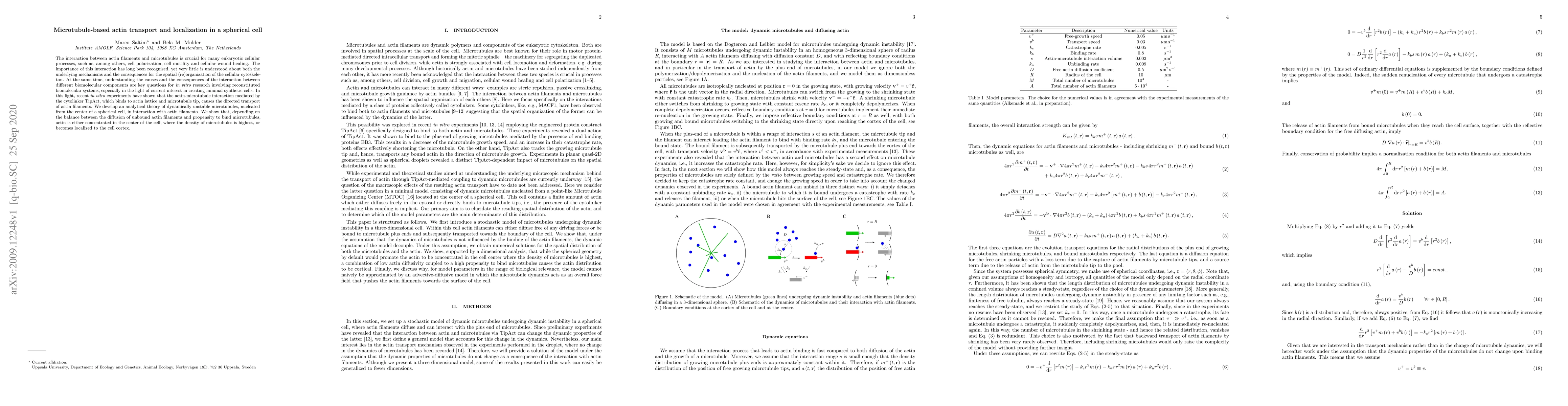 This paper develops an analytical theory to explain how microtubules interact with actin filaments in a spherical cell, showing that actin can either concentrate at the cell center or localize to the cortex depending on the balance between actin diffusion and microtubule binding. The findings provide insights into the mechanisms of actin-microtubule interaction and their role in cellular processes like polarization and motility.