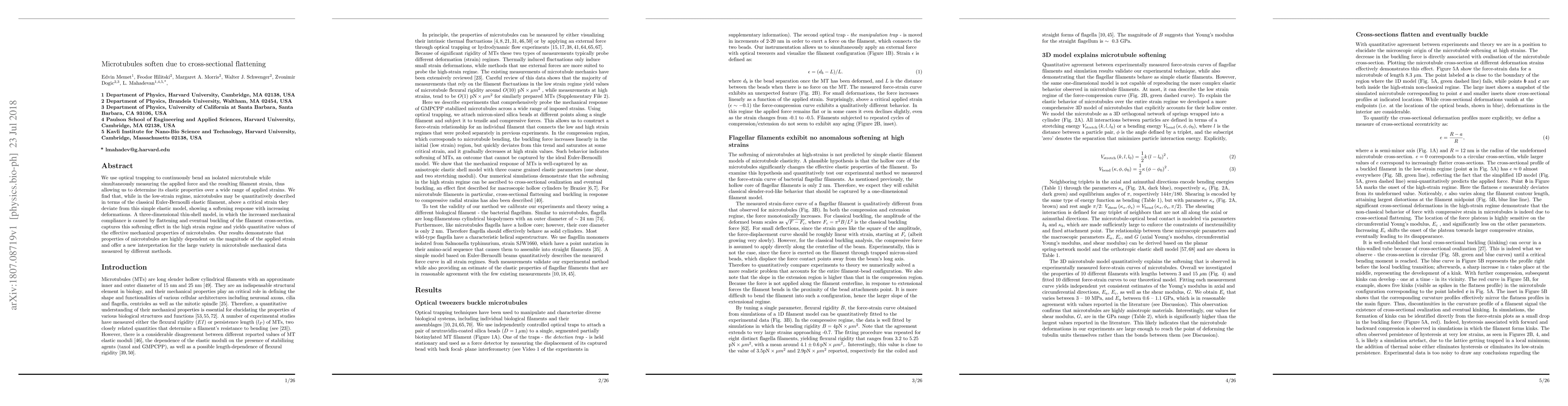 We use optical trapping to continuously bend an isolated microtubule while simultaneously measuring the applied force and the resulting filament strain, thus allowing us to determine its elastic properties over a wide range of applied strains. We find that, while in the low-strain regime, microtubules may be quantitatively described in terms of the classical Euler-Bernoulli elastic filament, above a critical strain they deviate from this simple elastic model, showing a softening response with increasingdeformations. A three-dimensional thin-shell model, in which the increased mechanical compliance is caused by flattening and eventual buckling of the filament cross-section, captures this softening effect in the high strain regime and yields quantitative values of the effective mechanical properties of microtubules. Our results demonstrate that properties of microtubules are highly dependent on the magnitude of the applied strain and offer a new interpretation for the large variety in microtubule mechanical data measured by different methods.