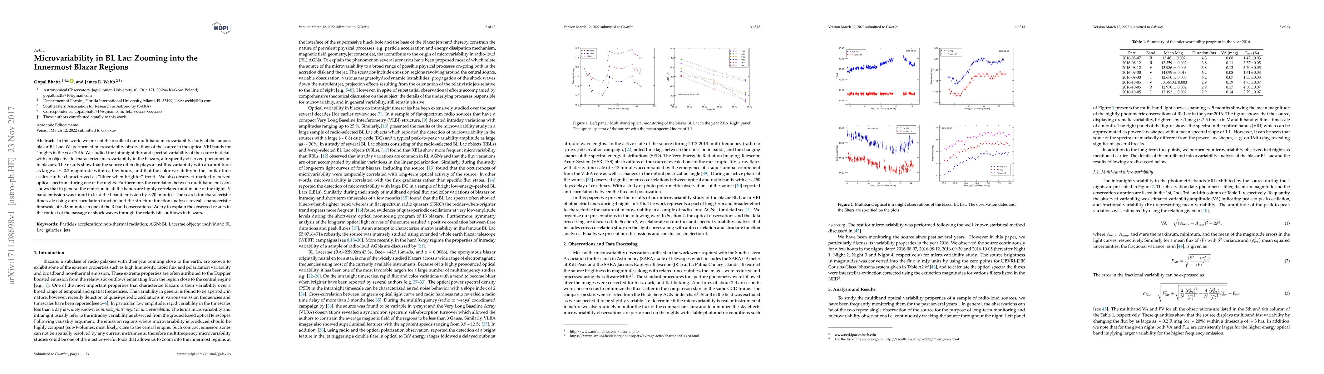 This study uses microvariability observations to investigate the innermost regions of a blazar (a type of active galactic nucleus) over 4 nights in 2016, revealing fast flux variability and 'bluer-when-brighter' color trends.