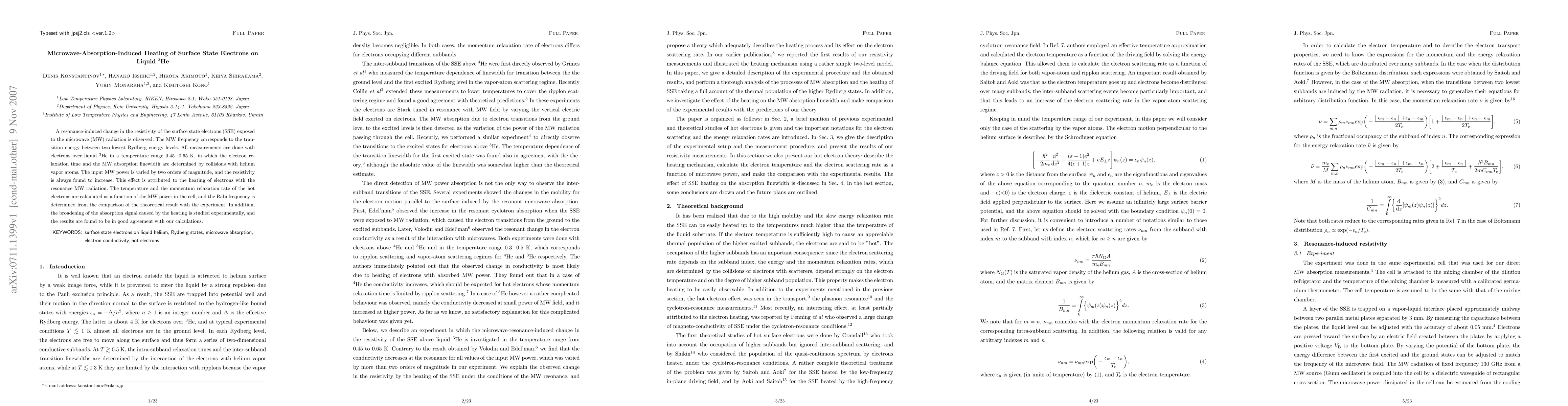 A resonance-induced change in the resistivity of the surface state electrons (SSE) exposed to the microwave (MW) radiation is observed. The MW frequency corresponds to the transition energy between two lowest Rydberg energy levels. All measurements are done with electrons over liquid 3He in a temperature range 0.45-0.65 K, in which the electron relaxation time and the MW absorption linewidth are determined by collisions with helium vapor atoms. The input MW power is varied by two orders of magnitude, and the resistivity is always found to increase. This effect is attributed to the heating of electrons with the resonance MW radiation. The temperature and the momentum relaxation rate of the hot electrons are calculated as a function of the MW power in the cell, and the Rabi frequency is determined from the comparison of the theoretical result with the experiment. In addition, the broadening of the absorption signal caused by the heating is studied experimentally, and the results are found to be in good agreement with our calculations.