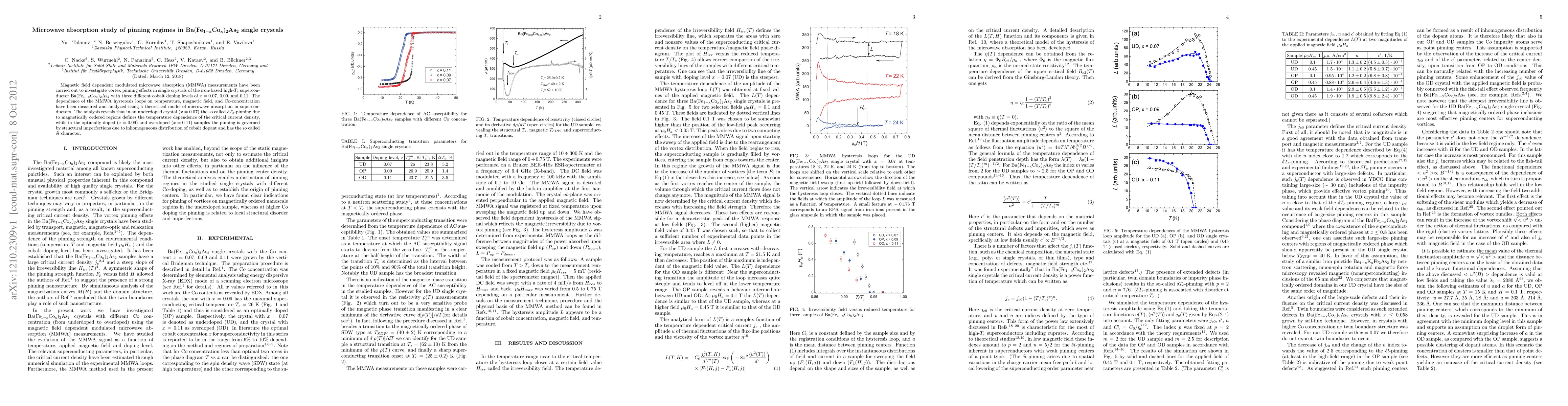 This study investigates vortex pinning effects in Ba(Fe_{1-x}Co_x)_2As_2 superconductors using modulated microwave absorption measurements. The results show that underdoped samples exhibit \dtc-pinning due to magnetic regions, while optimally and overdoped samples are pinned by structural imperfections with \delta-l character.