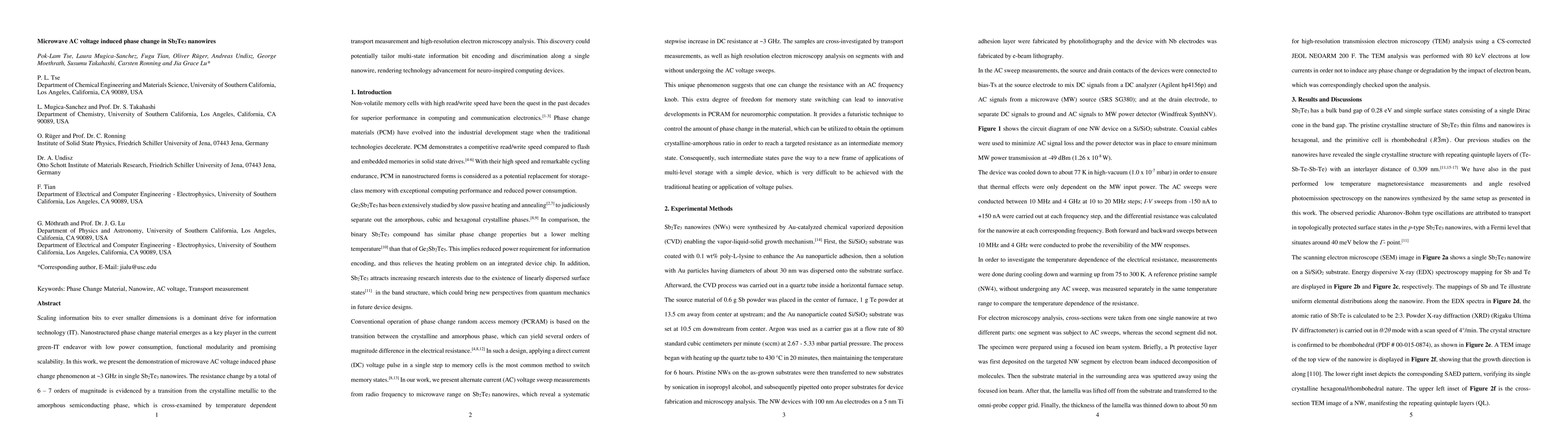 The research demonstrates microwave AC voltage-induced phase change in single Sb2Te3 nanowires at 3 GHz, causing a resistance change of 6-7 orders of magnitude. This transition from crystalline to amorphous phase, verified via temperature-dependent transport and high-resolution electron microscopy, could enable multi-state information encoding in neuro-inspired computing devices.