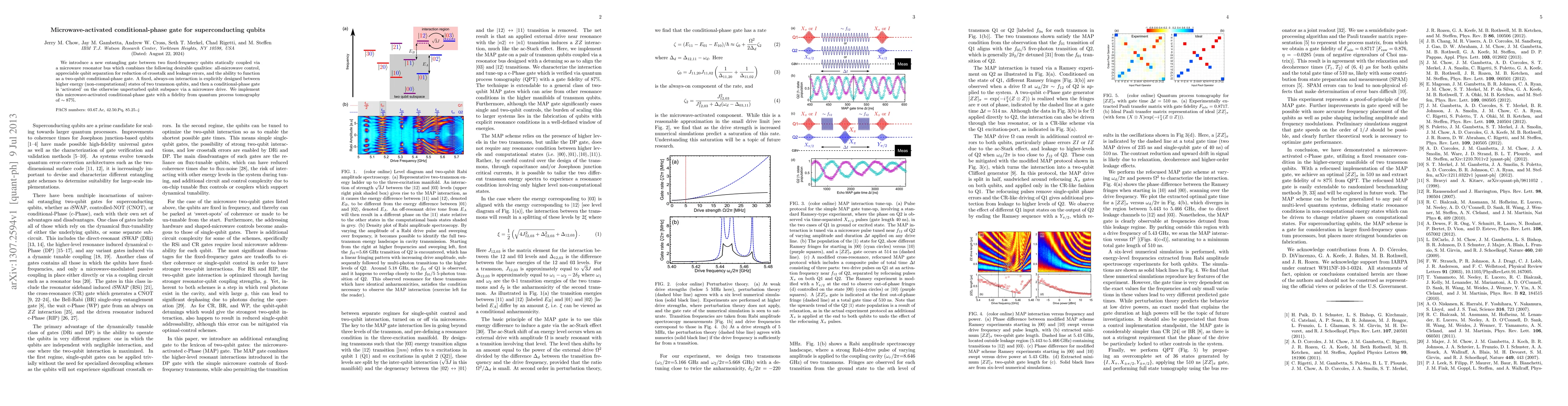 This paper presents a novel microwave-activated conditional-phase gate for superconducting qubits, utilizing a microwave resonator bus for all-microwave control and achieving 87% fidelity through quantum process tomography. The design minimizes crosstalk and leakage errors by maintaining appreciable qubit separation.