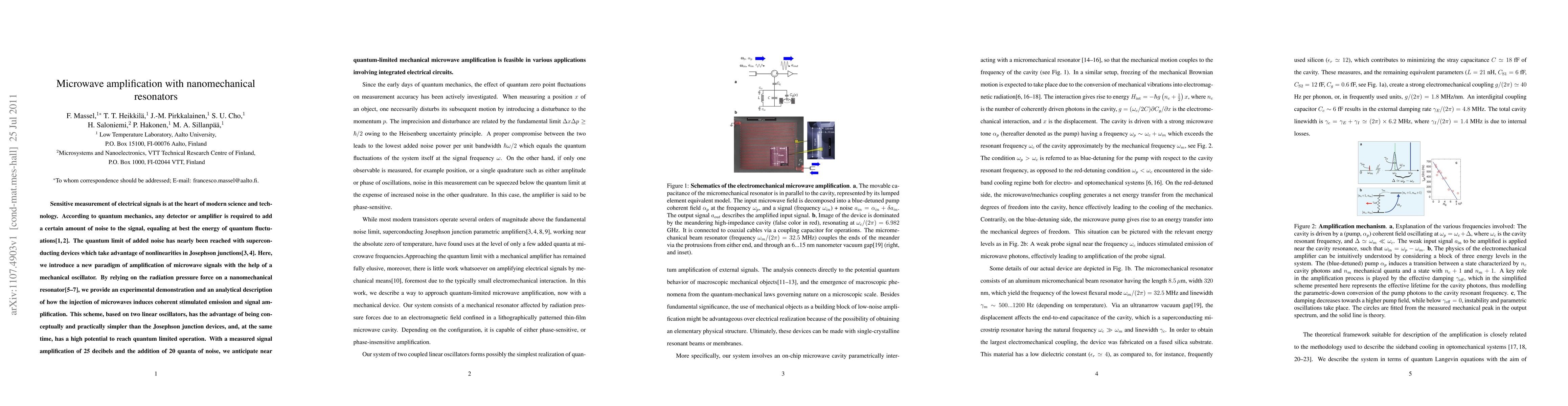 This paper demonstrates microwave signal amplification using a nanomechanical resonator, achieving 25 decibels of amplification with 20 quanta of added noise. The approach leverages radiation pressure and coherent stimulated emission, offering a simpler and potentially quantum-limited alternative to Josephson junction devices.