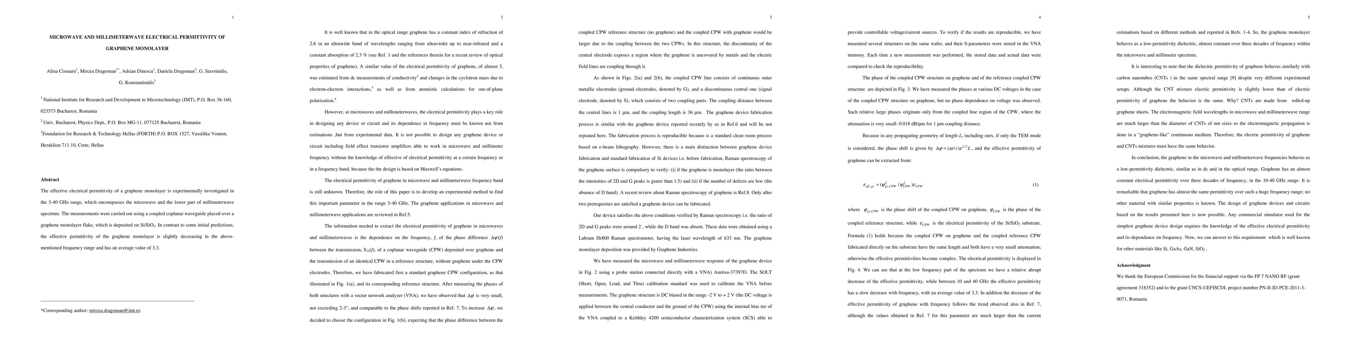 The effective electrical permittivity of a graphene monolayer was experimentally measured in the 5-40 GHz range, revealing a slight decrease in permittivity with frequency, contrary to some predictions, and averaging at 3.3. The measurements utilized a coupled coplanar waveguide over a graphene flake on Si/SiO2 substrate.