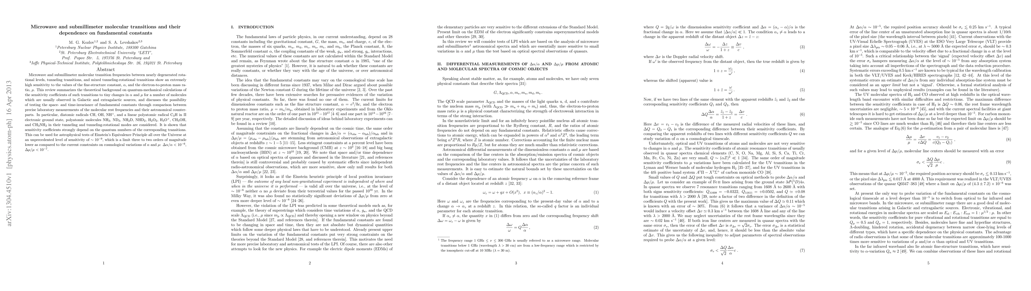 Microwave and submillimeter molecular transition frequencies between nearly degenerated rotational levels, tunneling transitions, and mixed tunneling-rotational transitions show an extremely high sensitivity to the values of the fine-structure constant, alpha, and the electron-to-proton mass ratio, mu. This review summarizes the theoretical background on quantum-mechanical calculations of the sensitivity coefficients of such transitions to tiny changes in alpha and mu for a number of molecules which are usually observed in Galactic and extragalactic sources, and discusses the possibility of testing the space- and time-invariance of fundamental constants through comparison between precise laboratory measurements of the molecular rest frequencies and their astronomical counterparts. In particular, diatomic radicals CH, OH, NH+, and a linear polyatomic radical C3H in Pi electronic ground state, polyatomic molecules NH3, ND3, NH2D, NHD2, H2O2, H3O+, CH3OH, and CH3NH2 in their tunneling and tunneling-rotational modes are considered. It is shown that sensitivity coefficients strongly depend on the quantum numbers of the corresponding transitions. This can be used for astrophysical tests of Einstein's Equivalence Principle all over the Universe at an unprecedented level of sensitivity of ~10^-9, which is a limit three to two orders of magnitude lower as compared to the current constraints on cosmological variations of alpha and mu: Delta alpha/alpha < 10^-6, Delta mu/mu < 10^-7.