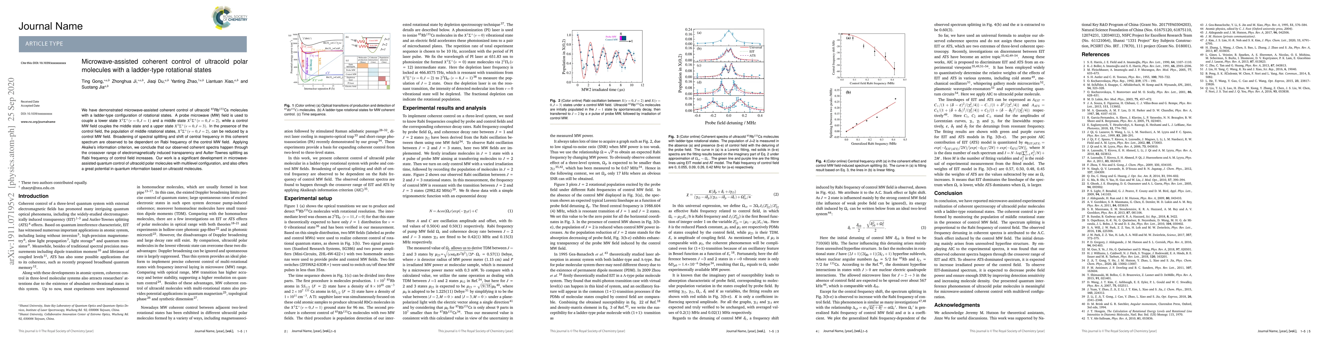 This paper demonstrates microwave-assisted coherent control of ultracold $^{85}$Rb$^{133}$Cs molecules with ladder-type rotational states, showing reduced population in middle states via control fields. The study reveals spectral broadening and frequency shifts dependent on the control field's Rabi frequency, indicating quantum control through electromagnetically induced transparency and Altuler-Townes splitting.