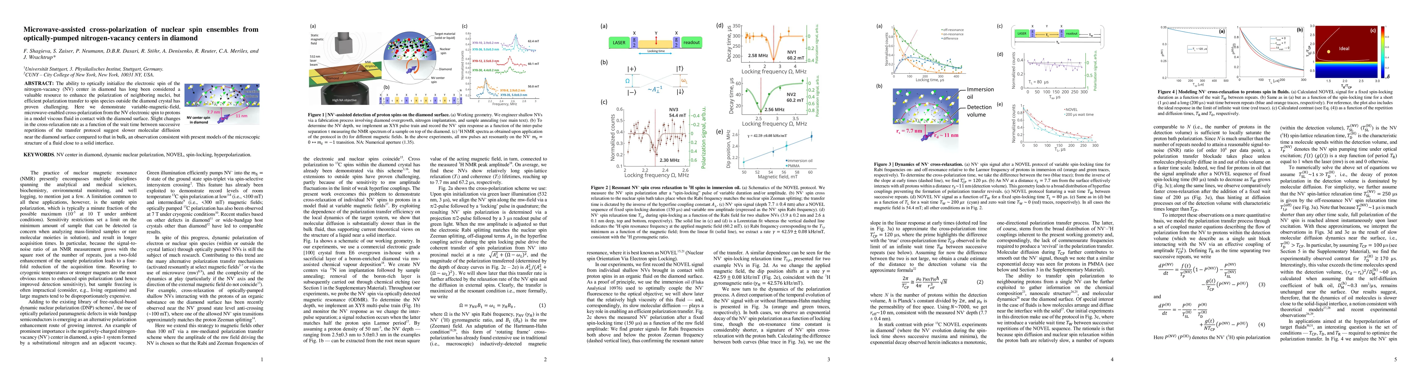 This paper demonstrates microwave-assisted cross-polarization of nuclear spin ensembles from optically-pumped nitrogen-vacancy centers in diamond to protons in a viscous fluid. The study reveals a slower molecular diffusion rate near the diamond surface, supporting current models of fluid-solid interfaces.