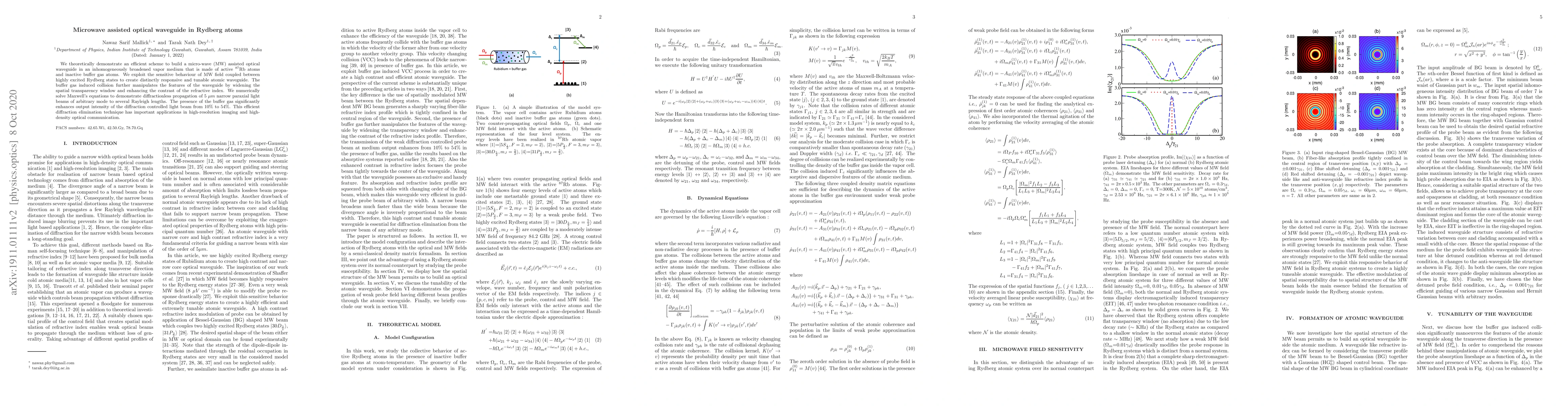 The paper proposes a microwave-assisted optical waveguide using Rydberg atoms in an 87 Rb vapor medium, exploiting microwave-Rydberg coupling and buffer gas collisions to enhance waveguide properties. Numerical solutions of Maxwell's equations demonstrate diffractionless propagation of light beams, significantly boosting output intensity, with applications in high-resolution imaging and optical communication.