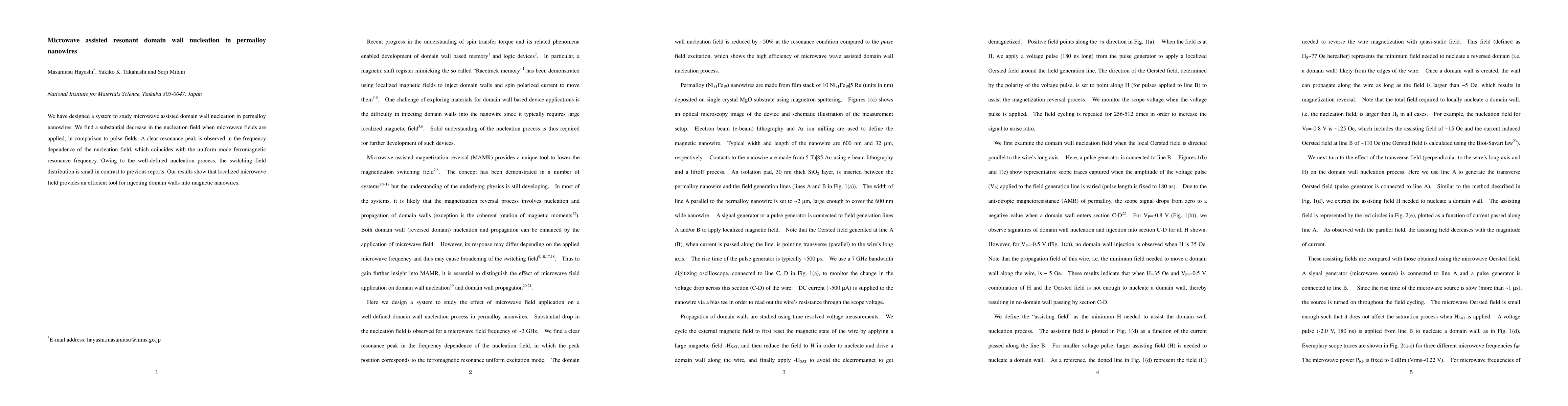 Summary: This study demonstrates microwave-assisted domain wall nucleation in permalloy nanowires, revealing a significant reduction in the nucleation field with microwave fields compared to pulse fields. The resonance peak aligns with the uniform mode ferromagnetic resonance frequency, resulting in a more controlled and efficient domain wall injection process.