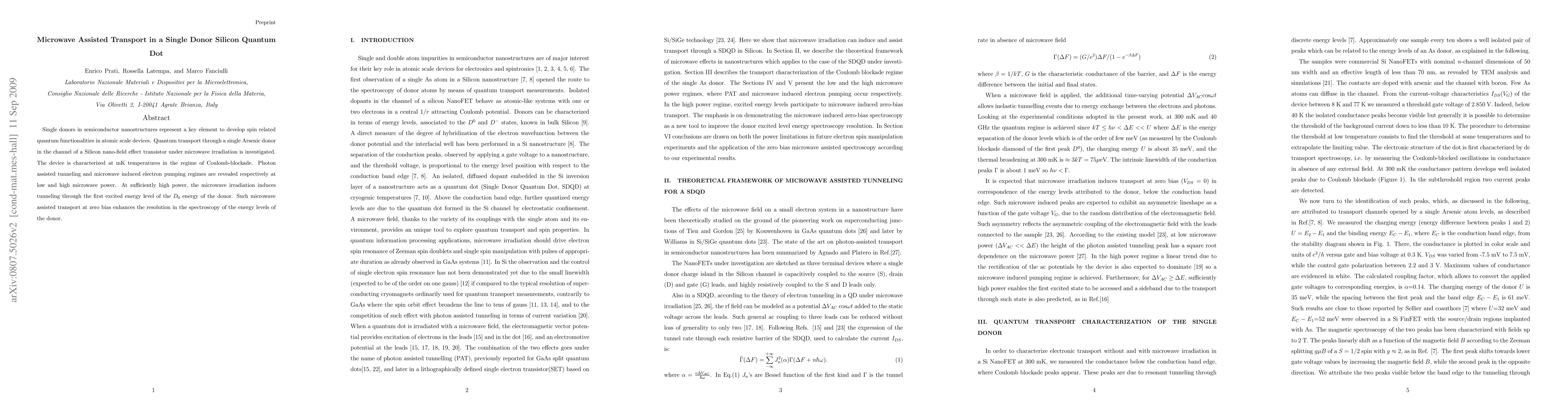 This paper investigates quantum transport in a silicon nano-field effect transistor with a single Arsenic donor under microwave irradiation, revealing photon-assisted tunneling and microwave-induced electron pumping, and showing enhanced resolution in donor energy level spectroscopy at high microwave power.