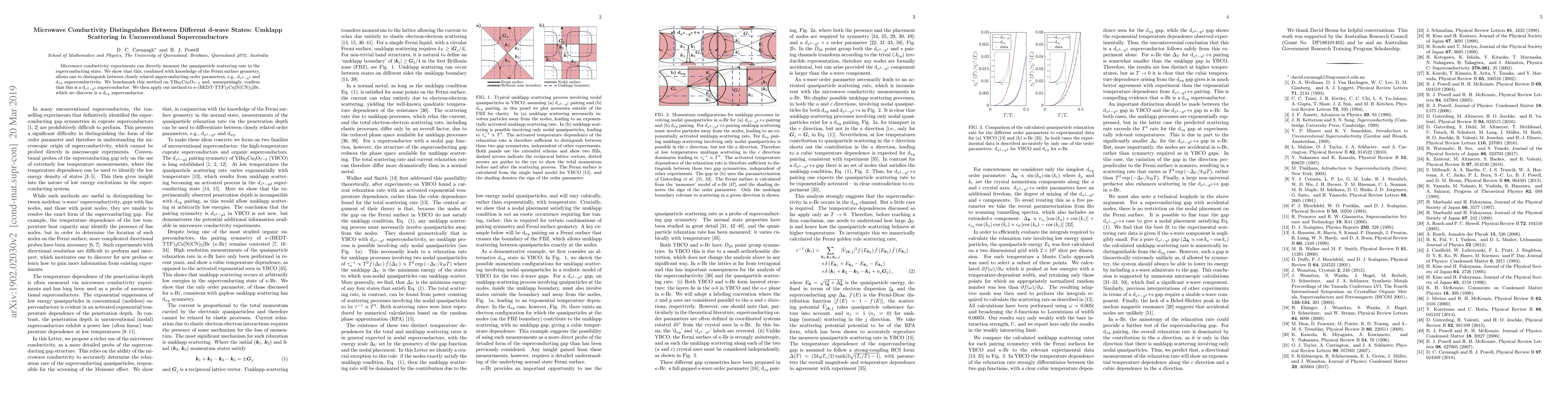 Microwave conductivity experiments can directly measure the quasiparticle scattering rate in the superconducting state. We show that this, combined with knowledge of the Fermi surface geometry, allows one to distinguish between closely related superconducting order parameters, e.g., d$_{x^2-y^2}$ and d$_{xy}$ superconductivity. We benchmark this method on YBa$_2$Cu$_3$O$_{7-\delta}$ and, unsurprisingly, confirm that this is a d$_{x^2-y^2}$ superconductor. We then apply our method to $\kappa$-(BEDT-TTF)$_2$Cu[N(CN)$_2$]Br, which we discover is a d$_{xy}$ superconductor.