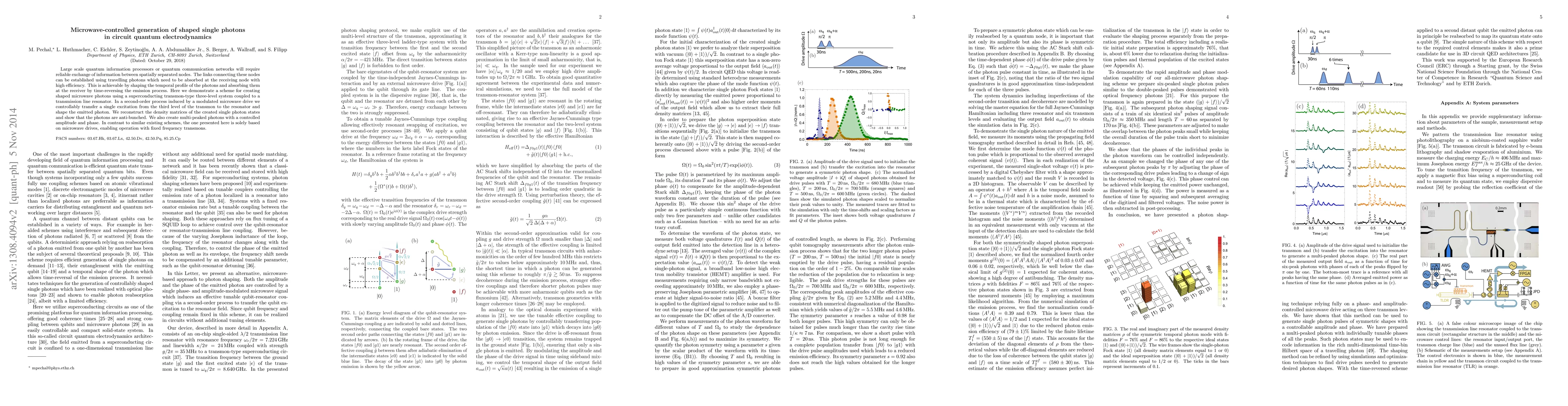 This paper presents a method for generating shaped single microwave photons using a superconducting transmon-type system coupled to a resonator, enabling efficient photon transfer for quantum communication networks. The scheme shapes emitted photons through a second-order microwave drive process, demonstrating antibunched and multipeaked photon states.