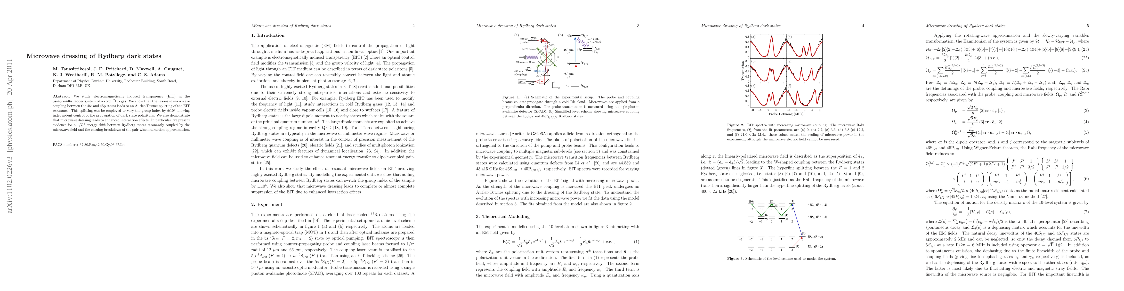This paper investigates electromagnetically induced transparency (EIT) in a cold $^{87}$Rb gas, demonstrating microwave-induced Autler-Townes splitting in the 5s$\rightarrow$5p$\rightarrow$46s ladder system. The study shows that microwave dressing of Rydberg dark states can modulate the group index by $\pm 10^5$ and reveals enhanced interaction effects, including a $1/R^3$ energy shift between coupled Rydberg states.