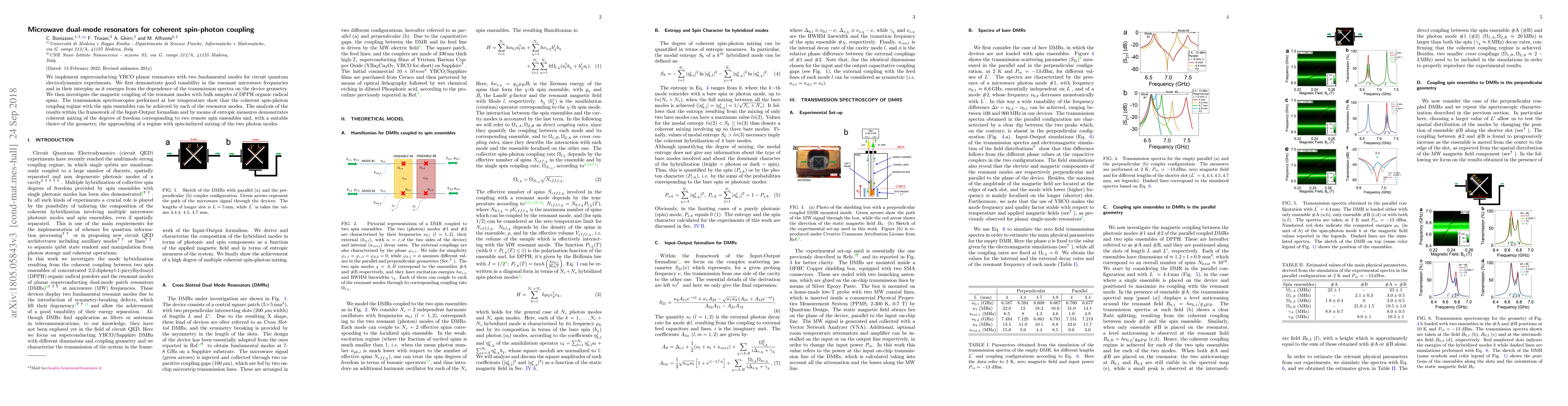 We implement superconducting YBCO planar resonators with two fundamental modes for circuit quantum electrodynamics experiments. We first demonstrate good tunability in the resonant microwave frequencies and in their interplay as it emerges from the dependence of the transmission spectra on the device geometry. We then investigate the magnetic coupling of the resonant modes with bulk samples of DPPH organic radical spins. The transmission spectroscopies performed at low temperature show that the coherent spin-photon coupling regime with the spin ensembles can be achieved by each of the resonator modes. The analysis of the results within the framework of the Input-Output formalism and by means of entropic measures demonstrates coherent mixing of the degrees of freedom corresponding to two remote spin ensembles and, with a suitable choice of the geometry, the approaching of a regime with spin-induced mixing of the two photon modes.