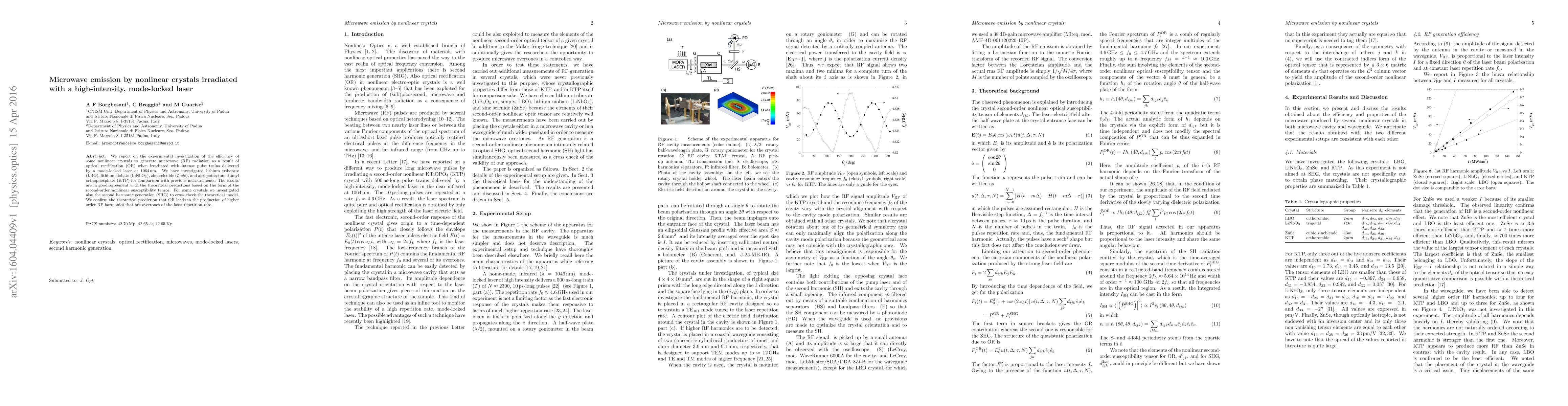 This paper investigates the microwave generation efficiency of nonlinear crystals like lithium triborate, lithium niobate, zinc selenide, and potassium titanyl orthophosphate via optical rectification when exposed to high-intensity, mode-locked laser pulses. The results align with theoretical predictions based on the second-order nonlinear susceptibility tensor, confirming the production of higher-order RF harmonics.