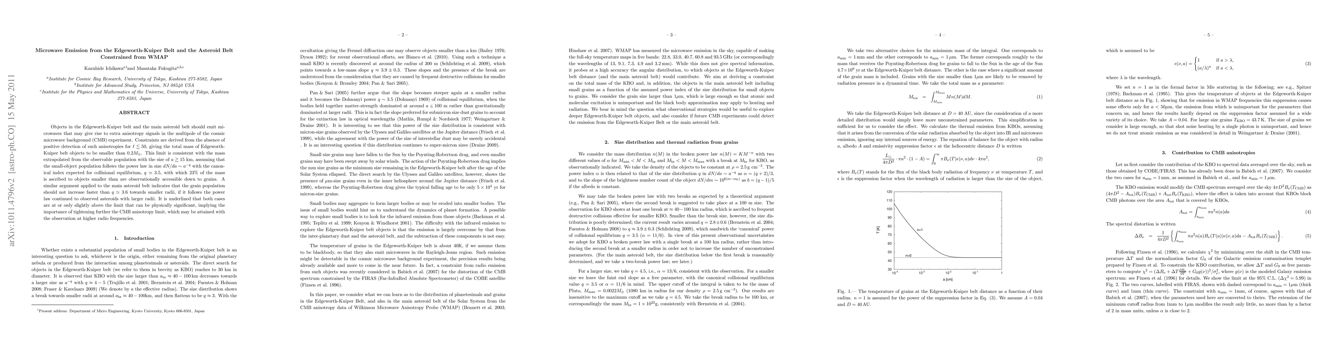 This study derives constraints on the total mass of objects in the Edgeworth-Kuiper belt and the main asteroid belt using microwave emission data from the WMAP, finding the mass of the Edgeworth-Kuiper belt to be less than 0.2 earth masses. The results suggest that the mass distribution follows a power law, with 23% of the mass in smaller, observationally inaccessible objects.