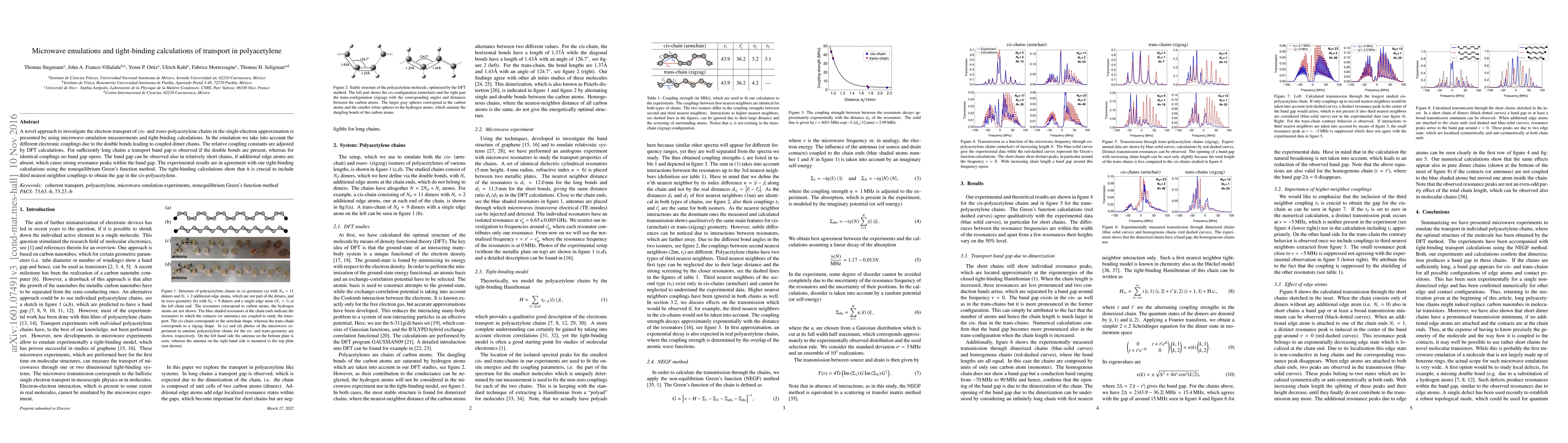 A novel approach to investigate the electron transport of cis- and trans-polyacetylene chains in the single-electron approximation is presented by using microwave emulation measurements and tight-binding calculations. In the emulation we take into account the different electronic couplings due to the double bonds leading to coupled dimer chains. The relative coupling constants are adjusted by DFT calculations. For sufficiently long chains a transport band gap is observed if the double bonds are present, whereas for identical couplings no band gap opens. The band gap can be observed also in relatively short chains, if additional edge atoms are absent, which cause strong resonance peaks within the band gap. The experimental results are in agreement with our tight-binding calculations using the nonequilibrium Green's function method. The tight-binding calculations show that it is crucial to include third nearest neighbor couplings to obtain the gap in the cis-polyacetylene.