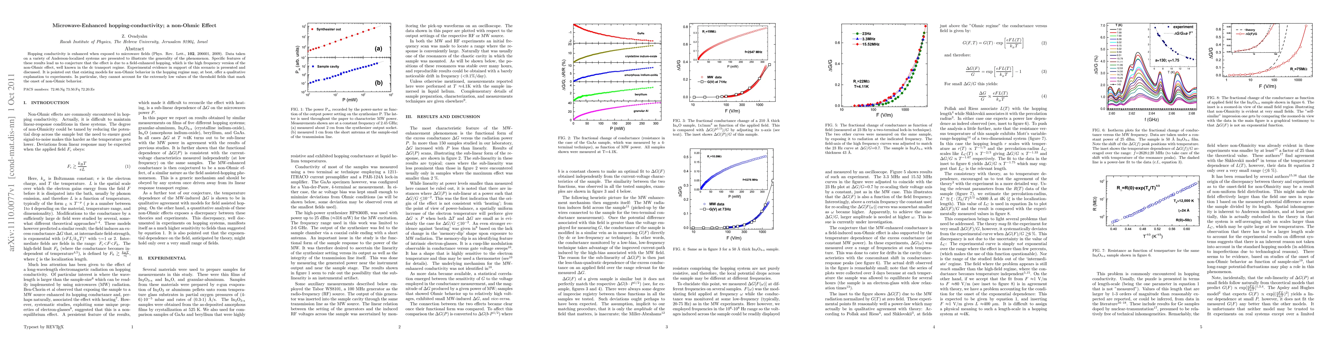 Researchers found that microwave exposure enhances hopping conductivity in certain materials, leading to a non-Ohmic effect, which is better explained by a field-enhanced hopping scenario than existing models.