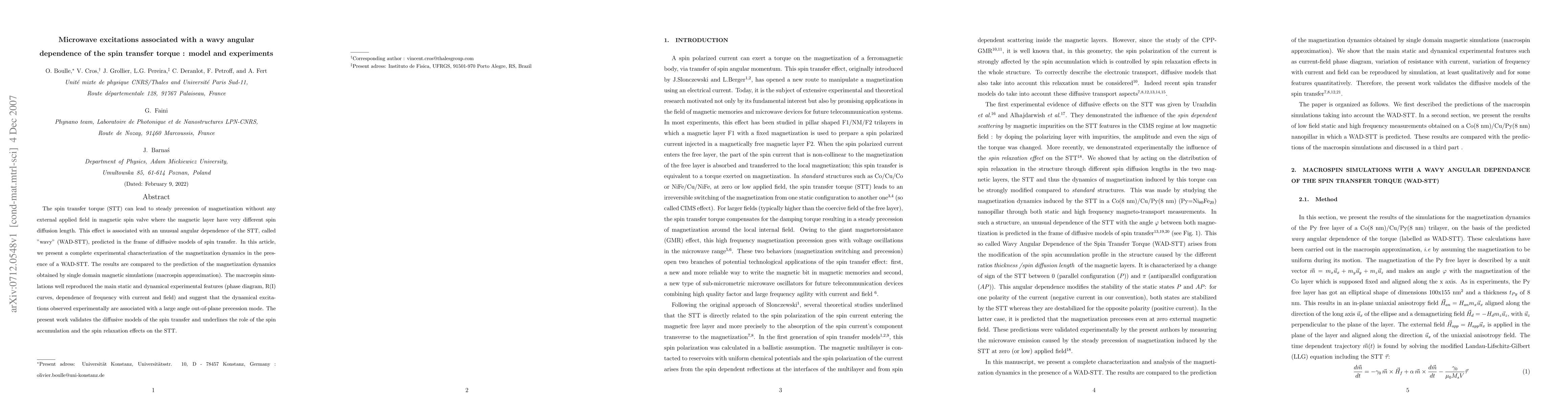 This paper investigates microwave excitations linked to a "wavy angular dependence" of spin transfer torque (WAD-STT) in magnetic spin valves, comparing experimental results with macrospin simulations. The simulations accurately reproduce observed dynamic features, confirming the role of spin accumulation and relaxation in WAD-STT-induced large angle out-of-plane precession.